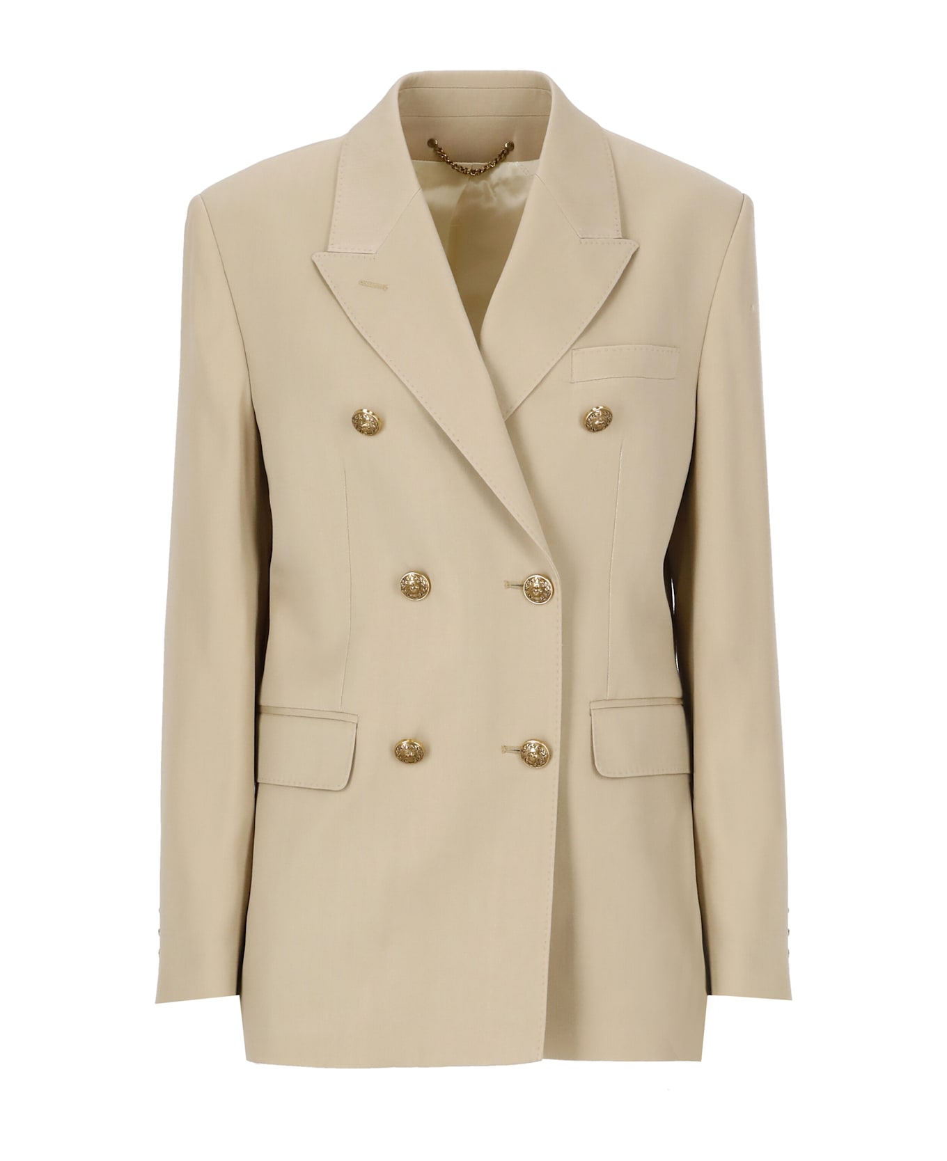 - Beige Golden Goose virgin wool woman's double breasted blazer - Peak lapel collar - Long sleeves with buttons at hem - Removable patch with embroidered logo at left sleeve - One breastpocket - Two side flap pockets - Front golden buttons fastening - One interior welt pocket - Rear iconic stars - Two side vents at hem