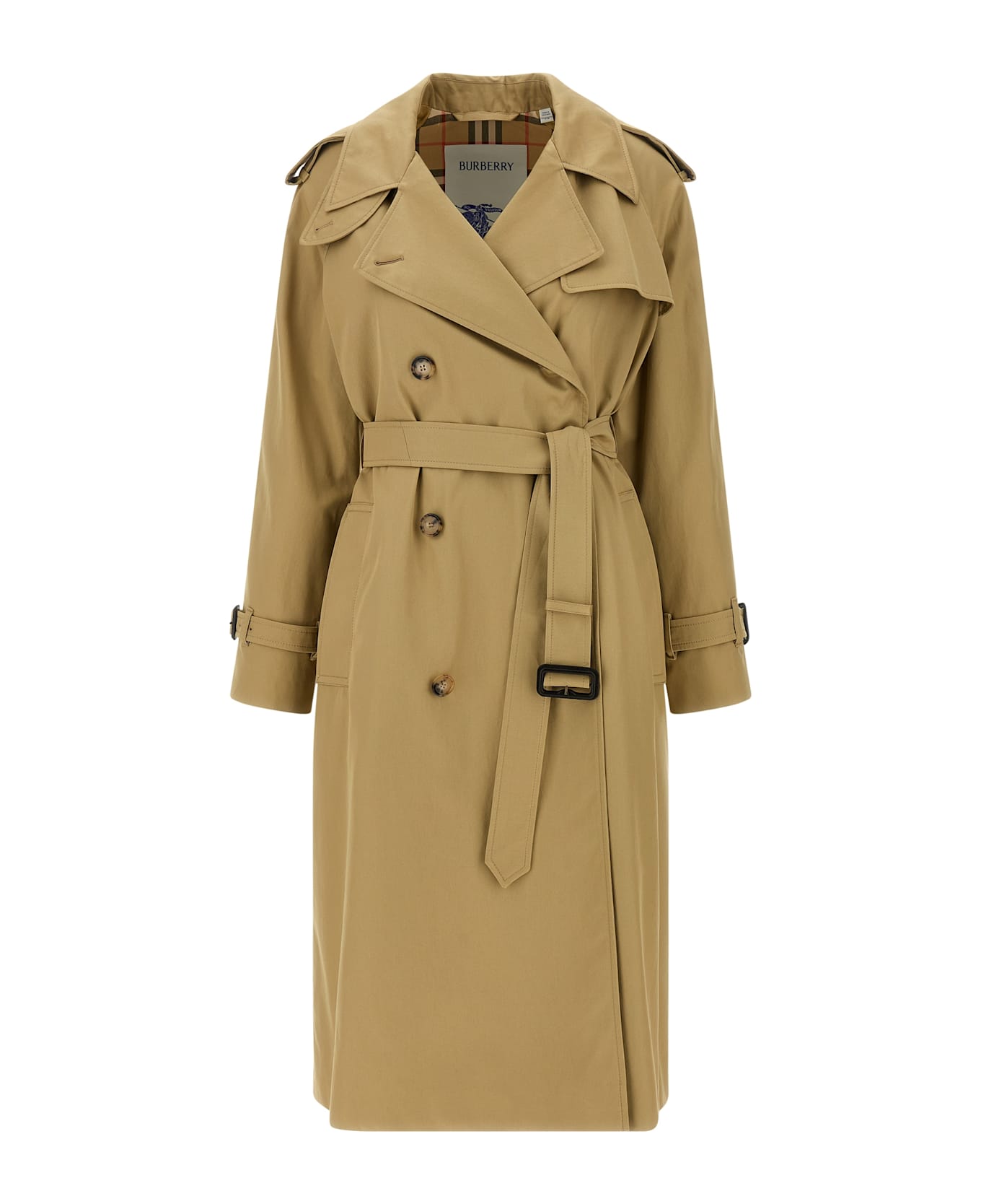 Long 'Castleford' waterproof cotton gabardine trench coat, Burberry Check lining and undercollar, double-breasted style with front button closure, lapel collar, removable chin strap, pockets, long cuffed sleeves, cape and back split, removable belt at the waist.