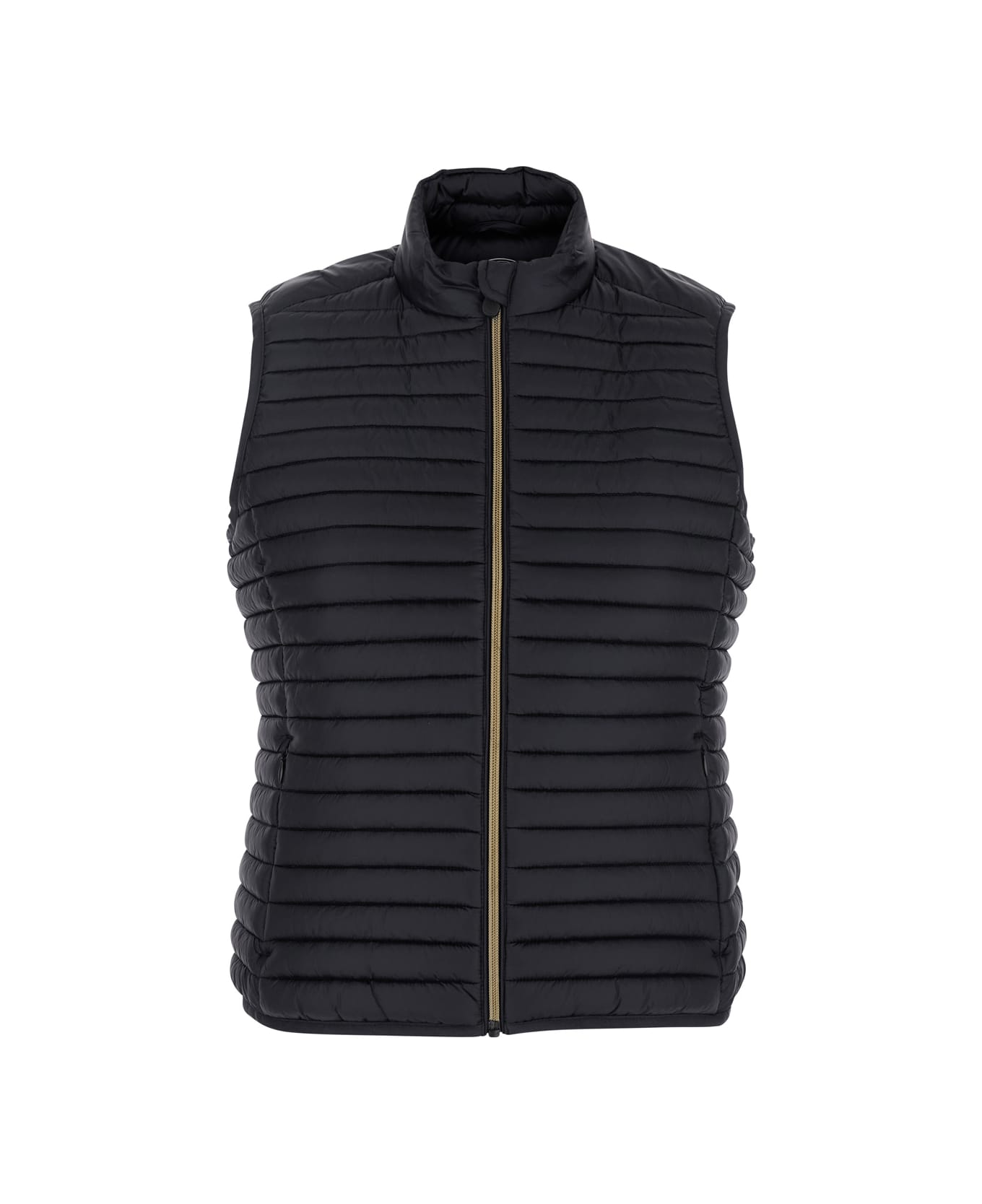 Down Jacket Black Zip hood Sleeveless Zip front closure Quilted design Rubber side logo patch Windproof and waterproof Two side zip pockets Internal pockets Quilted lining Tech fabric Regular fit