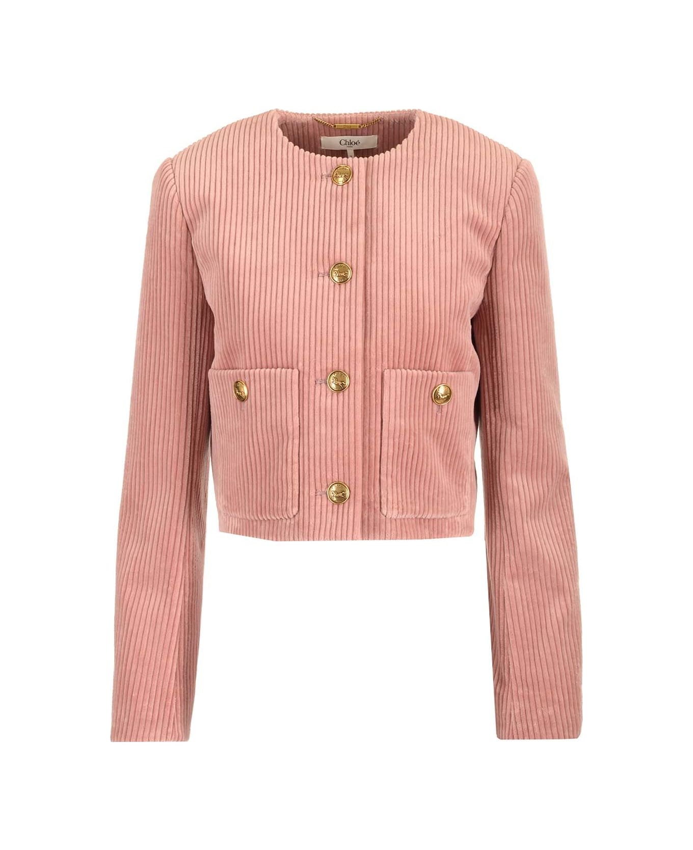 Cropped jacket in pink corduroy velvet with gold buttons and crew neck by Chloè.