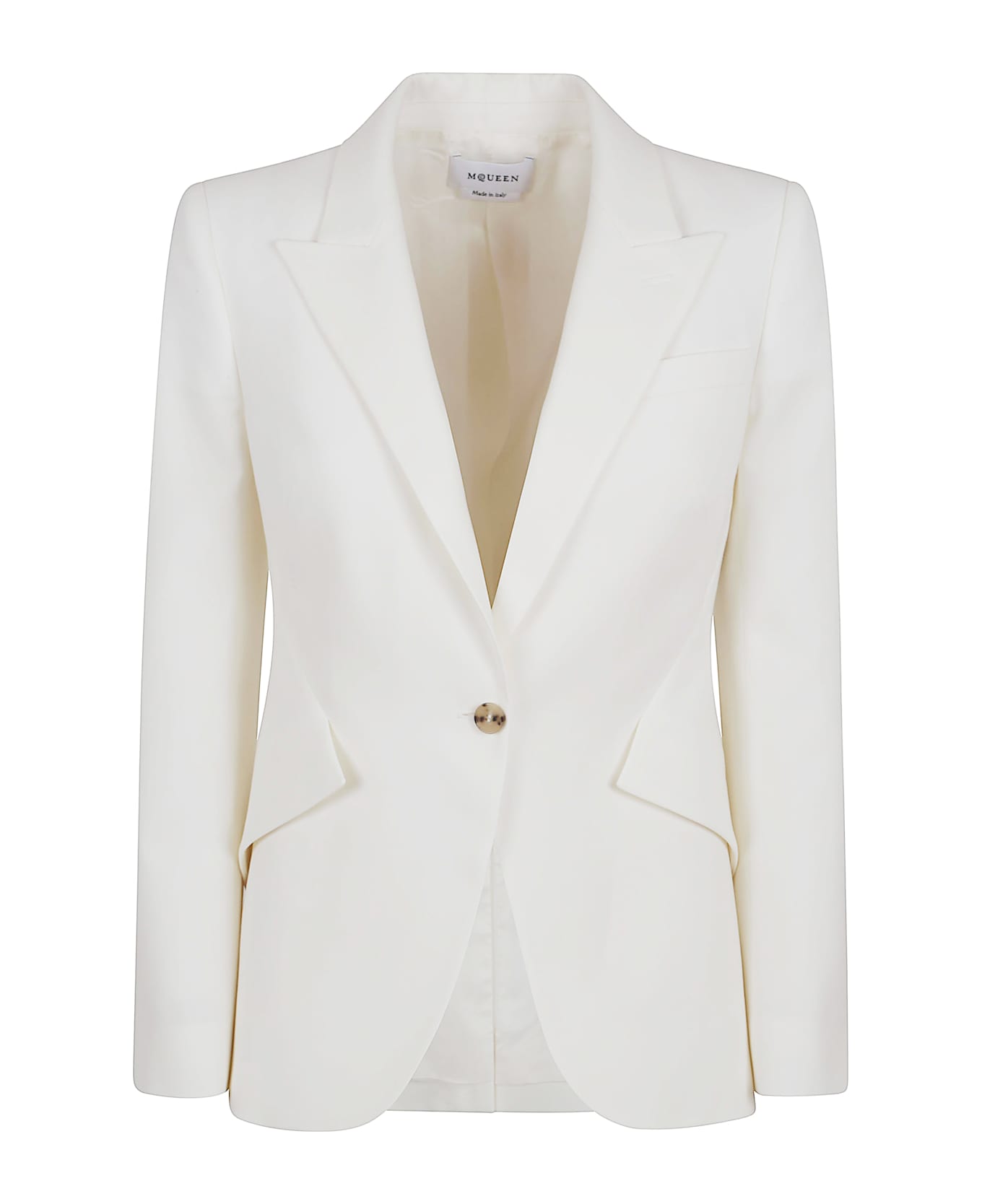 Single-breasted wool gabardine jacket by ALEXANDER MCQUEEN. Peak lapels; welt chest pocket and side flap pockets; single button closure.
