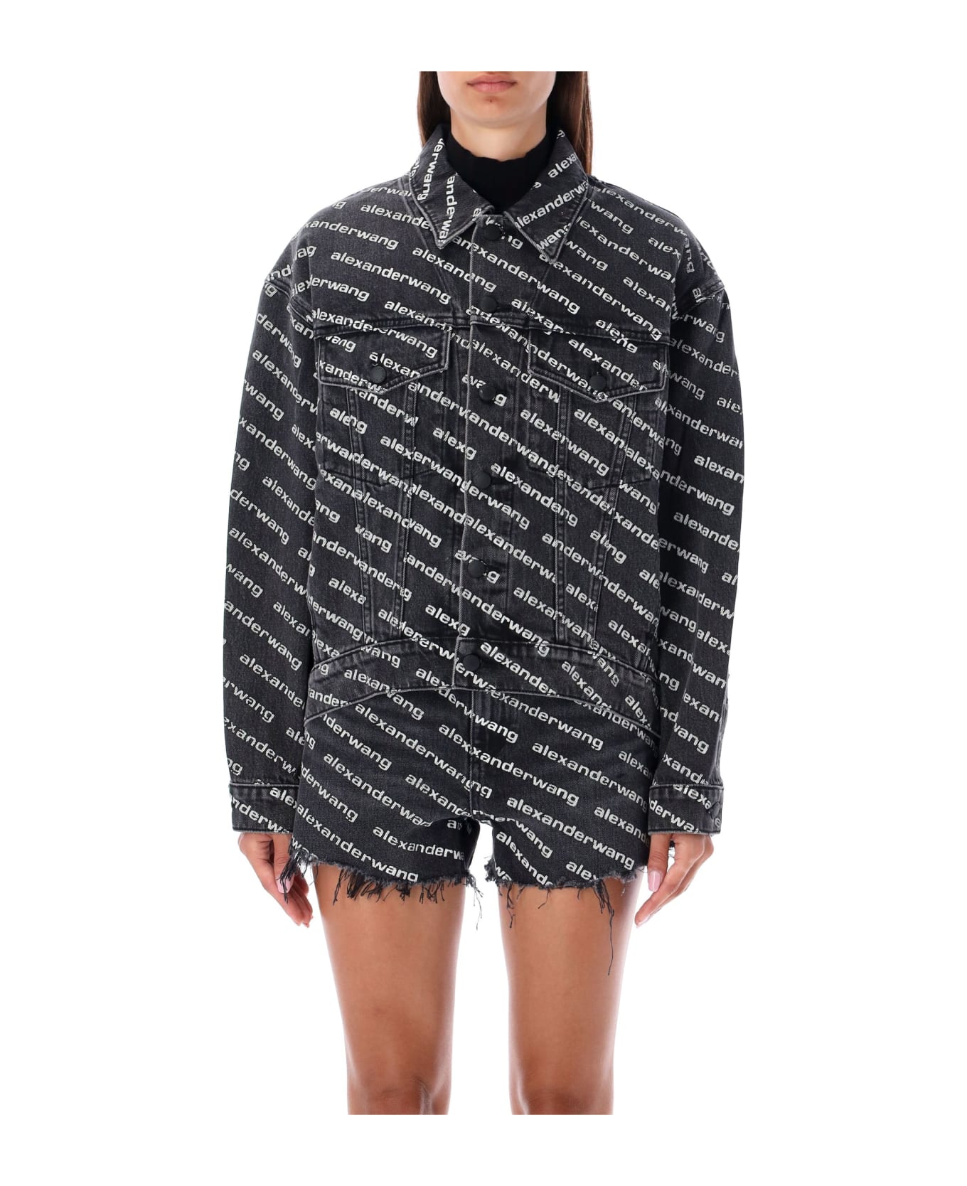 Falling Back Logo Denim Jacket By Alexander Wang. Featuring: Denim Jacket With Rounded Shoulders Exaggerated High-low Hemline Buttoned Patch Pockets At Front Button Closure Stitching Details Allover Logo Print Leather Logo Patch At Center Back Waisband Model Is 1,72 M Tall And She Is Wearing Size S