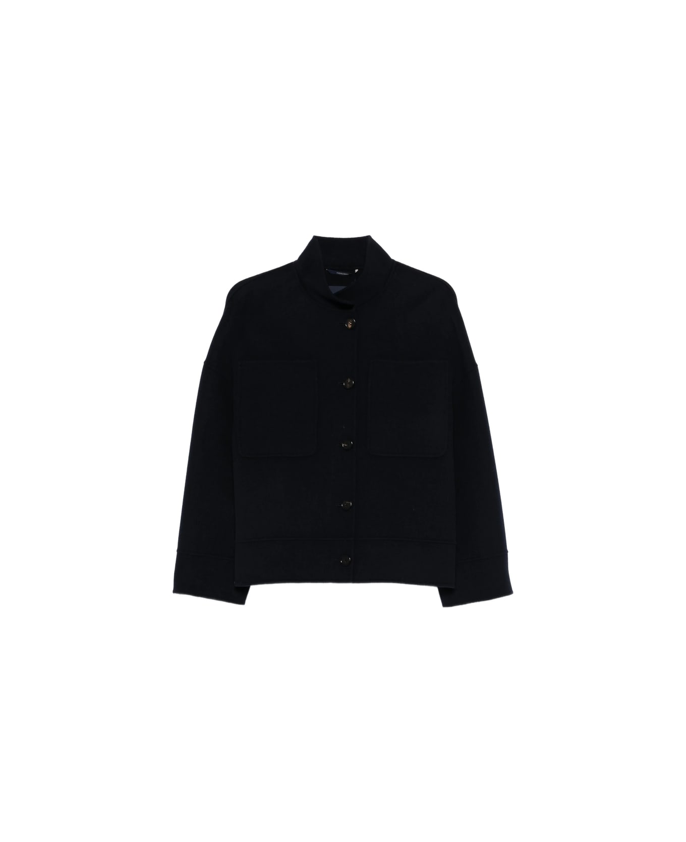 dark blue button fastening chest pockets high neck long sleeves straight hem