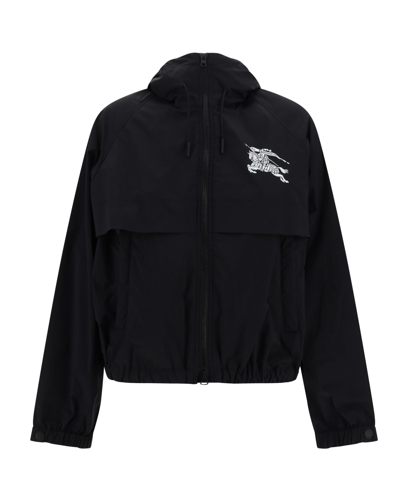 Sutterby hooded jacket by burberry, adjustable hood and drawstring model, front zipper closure, windproof flap on the front, stretch hem, iconic equestrian knight contrast graphics on the front, stretch cuffs, iconic brand monogram printed in contrast on the back.