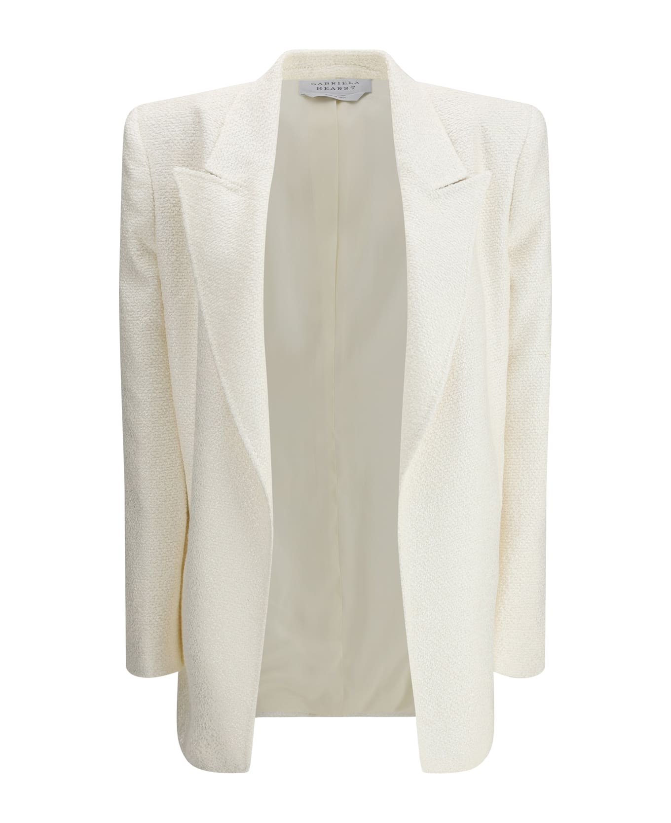 Gabriela hearst's mairi blazer is a sophisticated and elegant piece, crafted with a fine bouclé design that lends a unique texture and timeless appeal. featuring peaked lapels, the blazer has a flawless silhouette that flatters the figure, with refined details such as the two side slits that add movement and comfort. perfect for a look that is as formal as it is casual-chic, this blazer embodies the essence of fashion that combines tradition and innovation, a must-have for those seeking understated yet refined elegance.