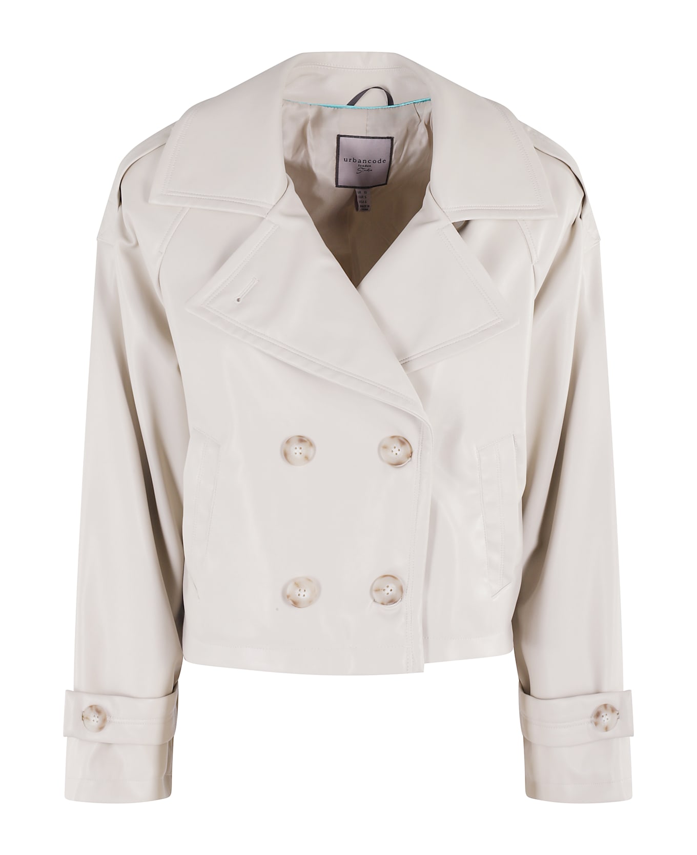 Eco Trench Coat - Urbancode - Bone color - Faux leather fabric - Lapel neckline - Raglan sleeves with toggles - Flush side pockets - Double-breasted button closure - Short pattern - Loose fit