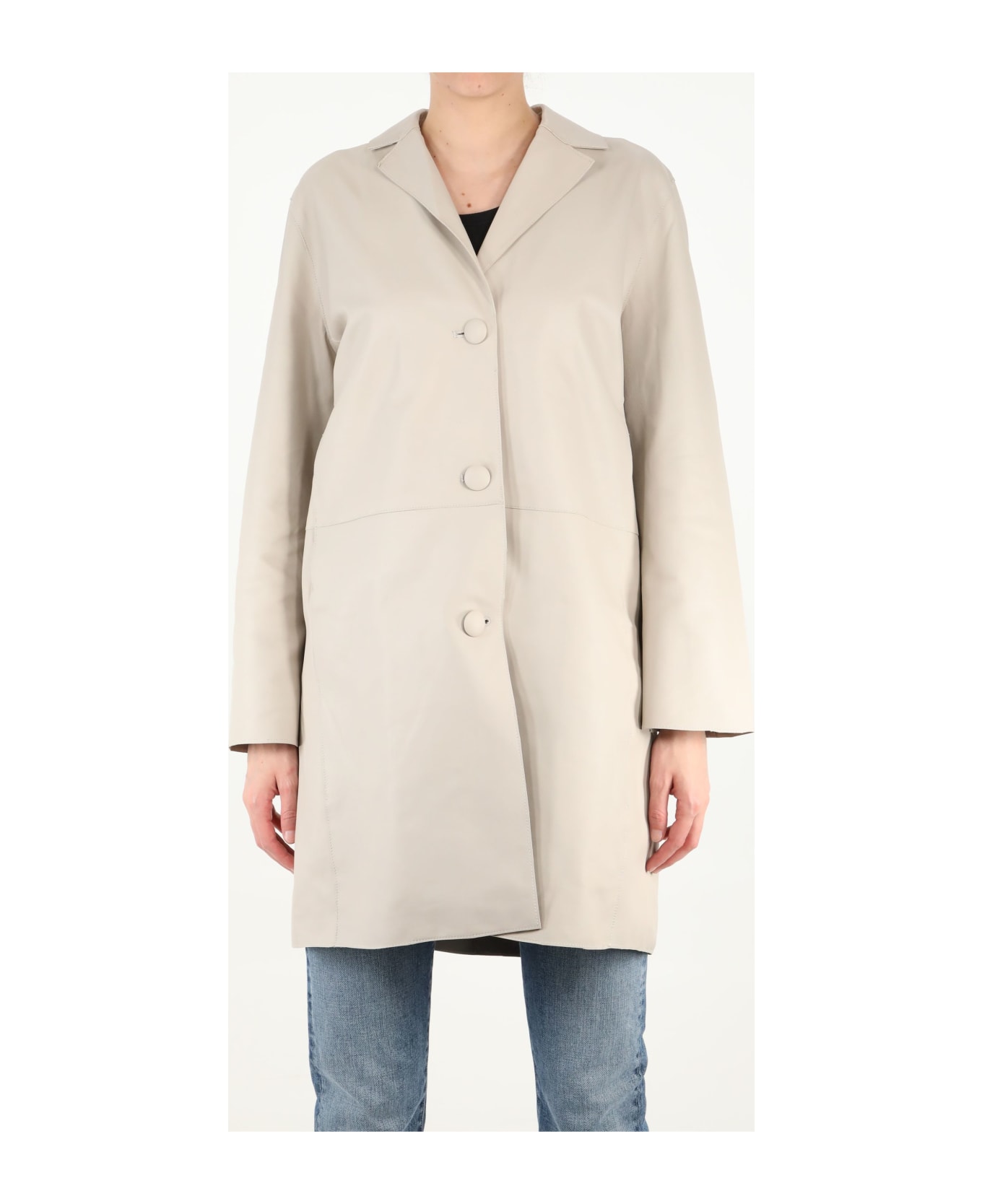 Putty-colored leather dust coat with peaked lapel and front closure with buttons.