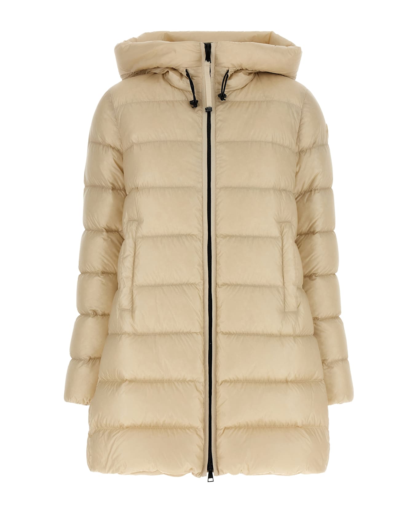 'Suyenne' midi down jacket in boudin quilted nylon with goose down padding, flared silhouette, adjustable hood, front zip closure, pockets, long sleeves with elastic cuffs and felt logo patch appliqué, SUSTAINABLE: Product made with recycled materials.