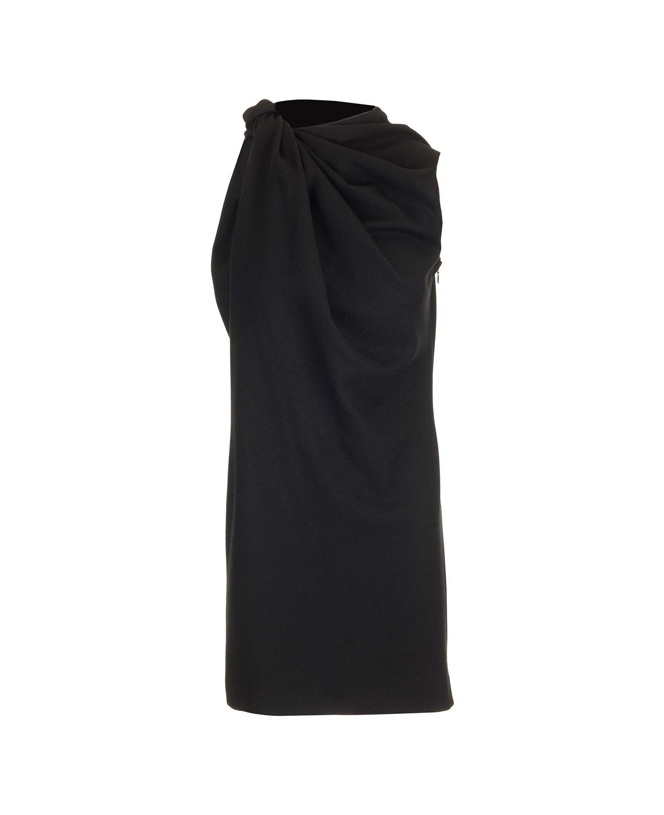 Black lightweight wool crepe minidress by Alexander McQueen featuring a crew neck with knotted shoulder detail and side zip fastening.