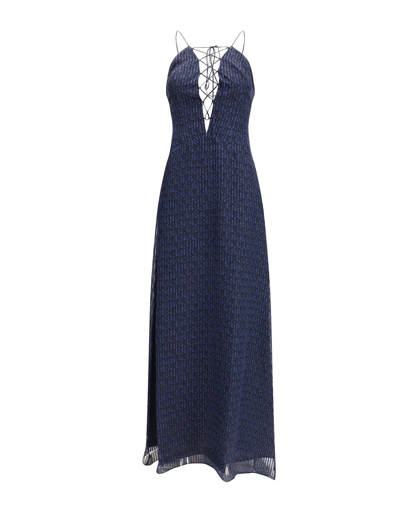 The charlene amnesia long dress by kristina ti embodies an ethereal, sensual femininity. crafted from striped jacquard silk with a floral print, it features delicate thin straps, an open back and a deep v neckline. the design is enhanced by an elegant interplay of adjustable criss-cross laces across the décolleté, shaping the silhouette with lightness and sophistication, and evoking a romantic, refined allure.