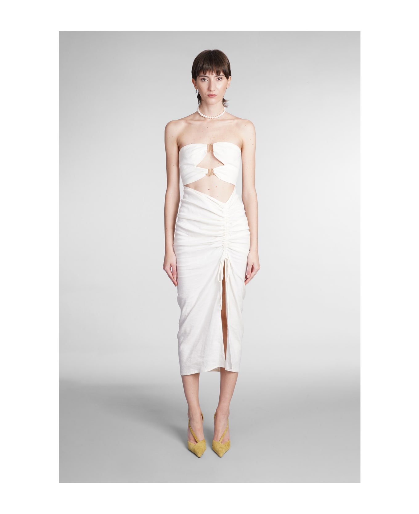 Donna Dress in white linen, sleeveless, cut out detail, front slit, strapless, zip clousure, gold hardware, 51% linen, 47% rayon, 2% spandex, Made in China, Model is 180cm and wears size 2