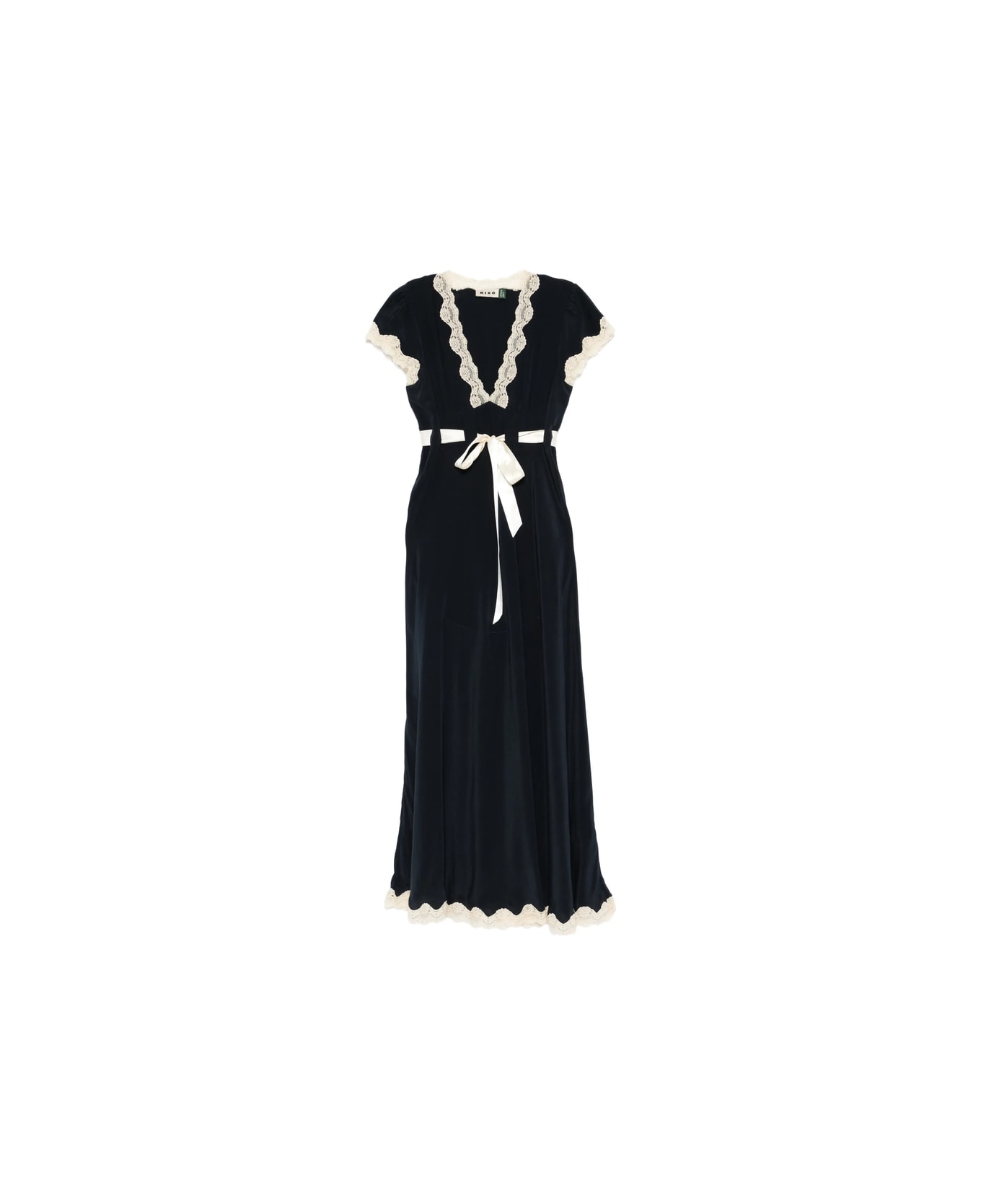 deep navy lace trim V-neck tie at waist short sleeves