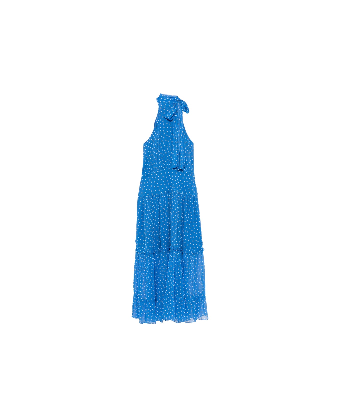 blue polka dot print halterneck tie detail tiered skirt ruffle trim