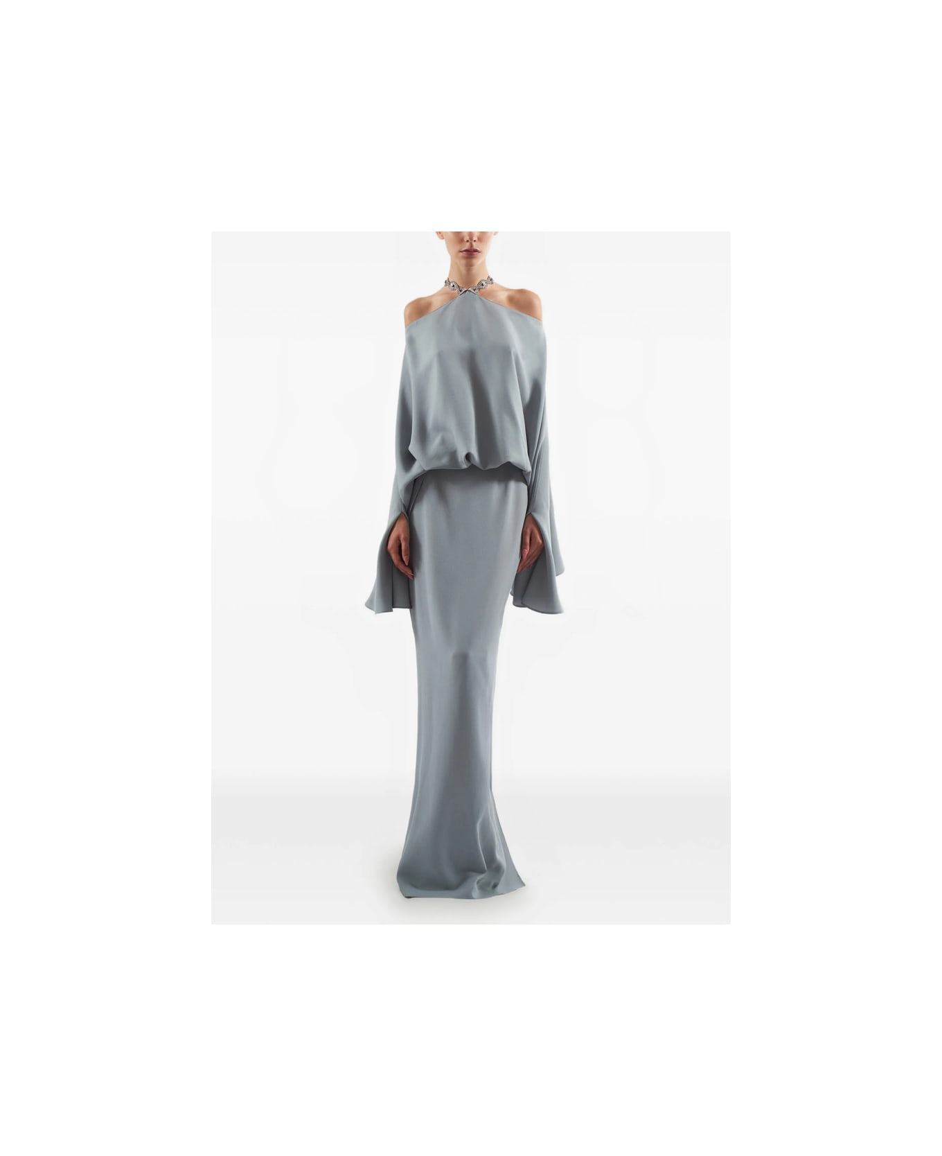 blue crystal embellishment off-shoulder flared sleeves elasticated waist rear slit