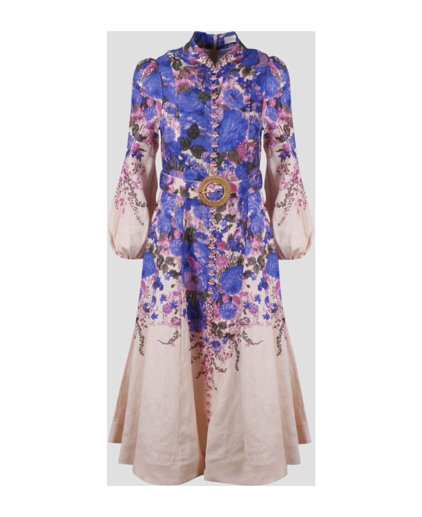 Zimmermann linen midi dress, with printed contrasting floral pattern. - SS23 - High stand collar - Front flower-inspired buttons closure - Blouson sleeves - Removable matching belt at the waist - Side pockets - Made in China - 100%Linen
