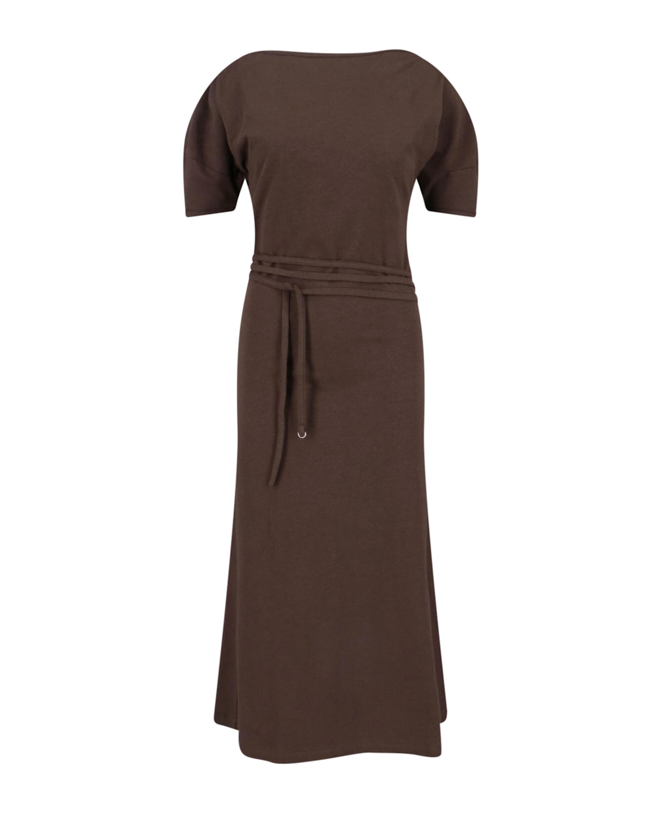 Lemaire midi dress in brown cotton-linen blend, round neckline, short sleeves, waist tie detail, straight fit. Composition: 70% Cotton, 30% Linen