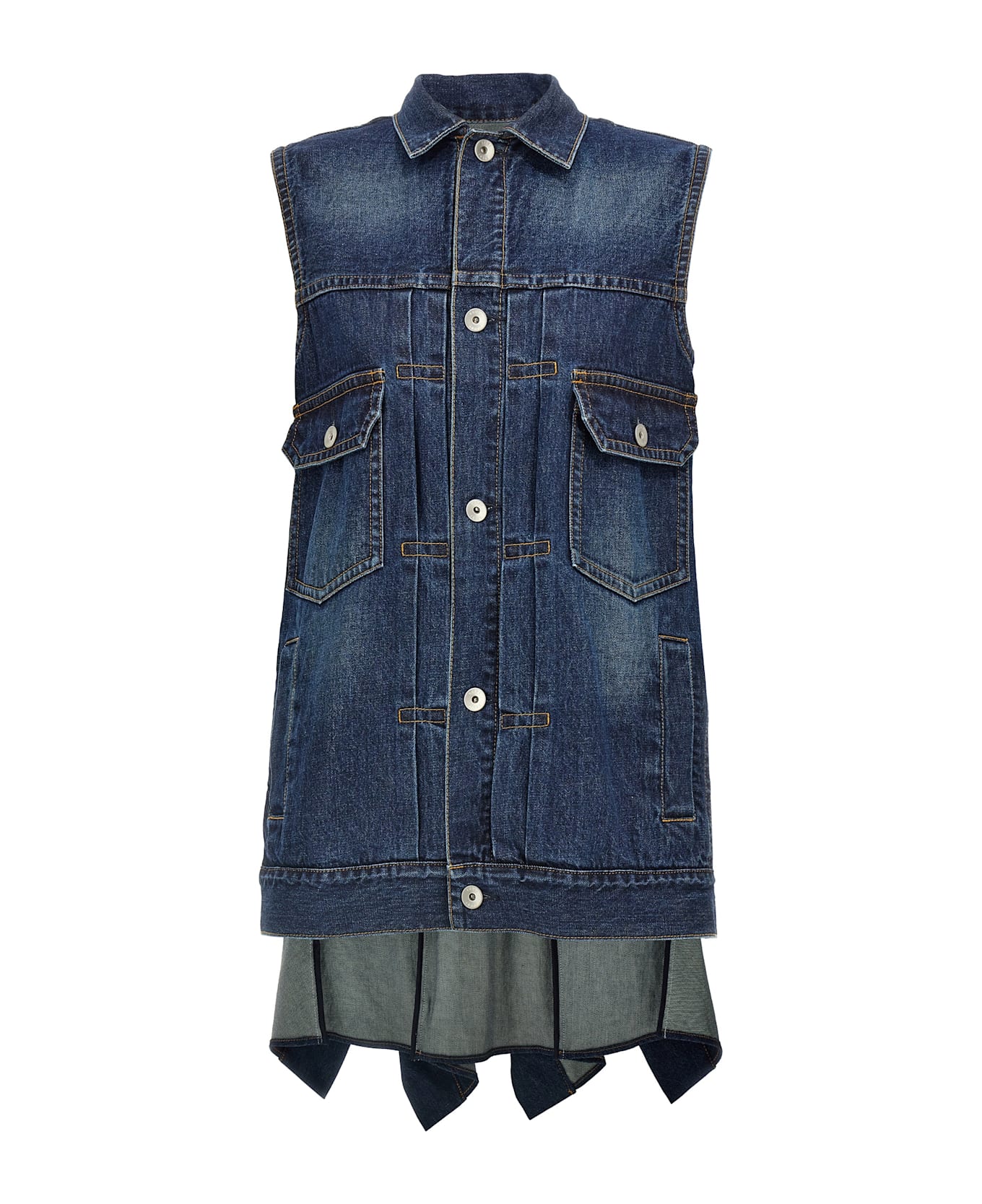 Cotton denim mini dress with button closure, sleeveless, pockets, ruffles appliqué on the back, and asymmetrical hem.