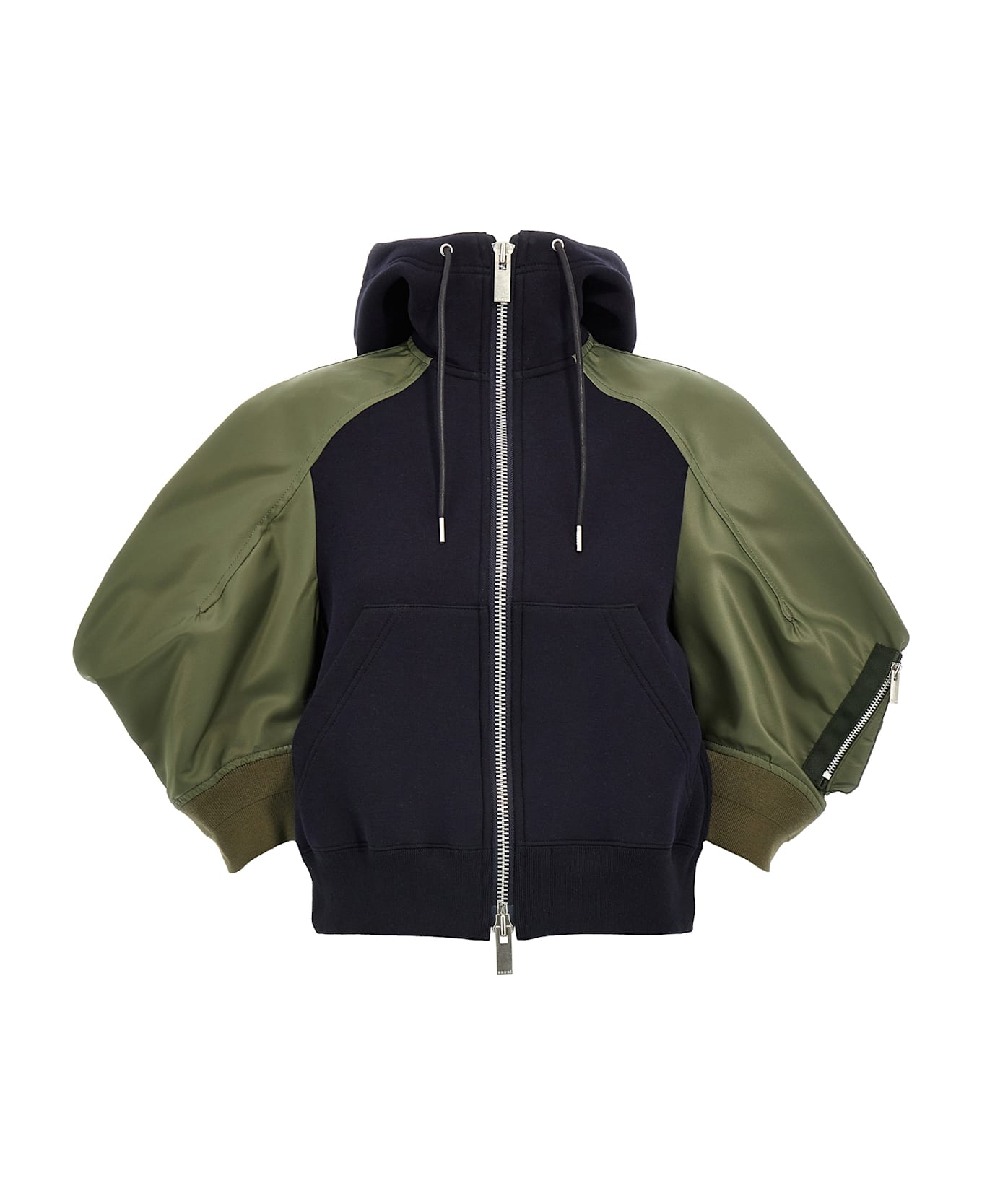 'Sponge' cotton blend hoodie with contrasting 3/4 puff sleeves in nylon with elastic cuffs, zip closure, pockets.