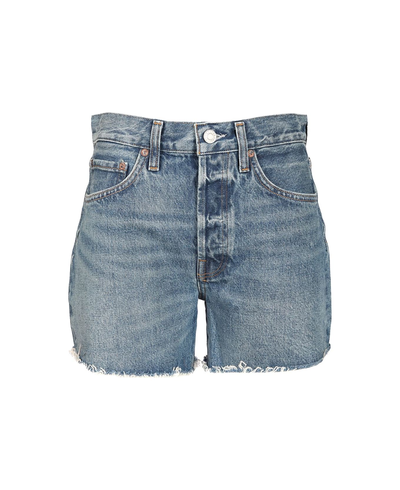 "Parker Long" vintage medium indigo denim shorts from Agolde, five pocket, with button fastening and hidden zip.