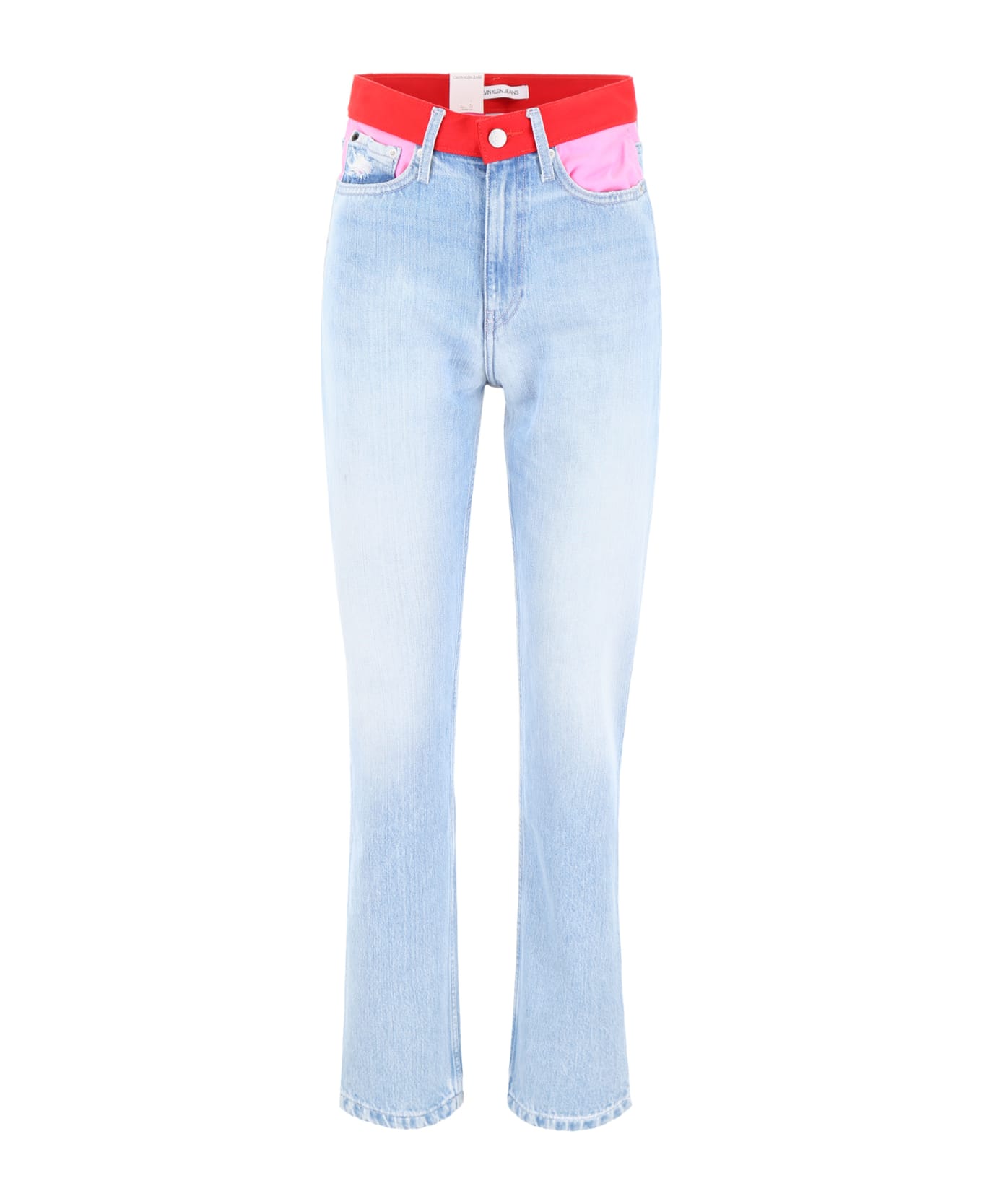 Calvin Klein Jeans cotton denim jeans with straight leg. Five pockets, zip and button closure, colorblock waist and leather logo label on the back. Model height is 177 cm and she is wearing a size 27.