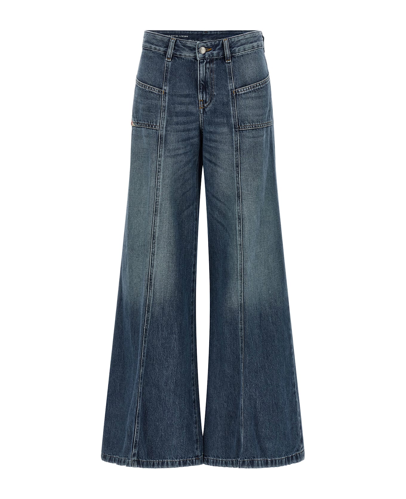 'D-Akii 09m56' stonewashed cotton denim jeans with low waist, extra wide flared leg, front zip and button closure, 'Hush' pockets, logo tag and back logo embroidery. SUSTAINABLE: This product is made with recycled cotton. Composition: 100% cotton