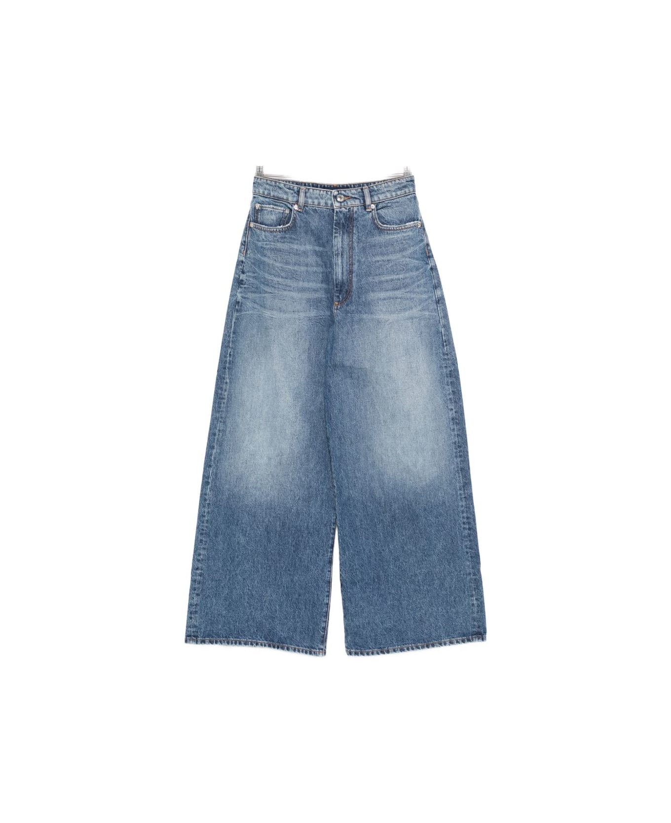 blue, wide leg, five pockets, concealed fly and button fastening.