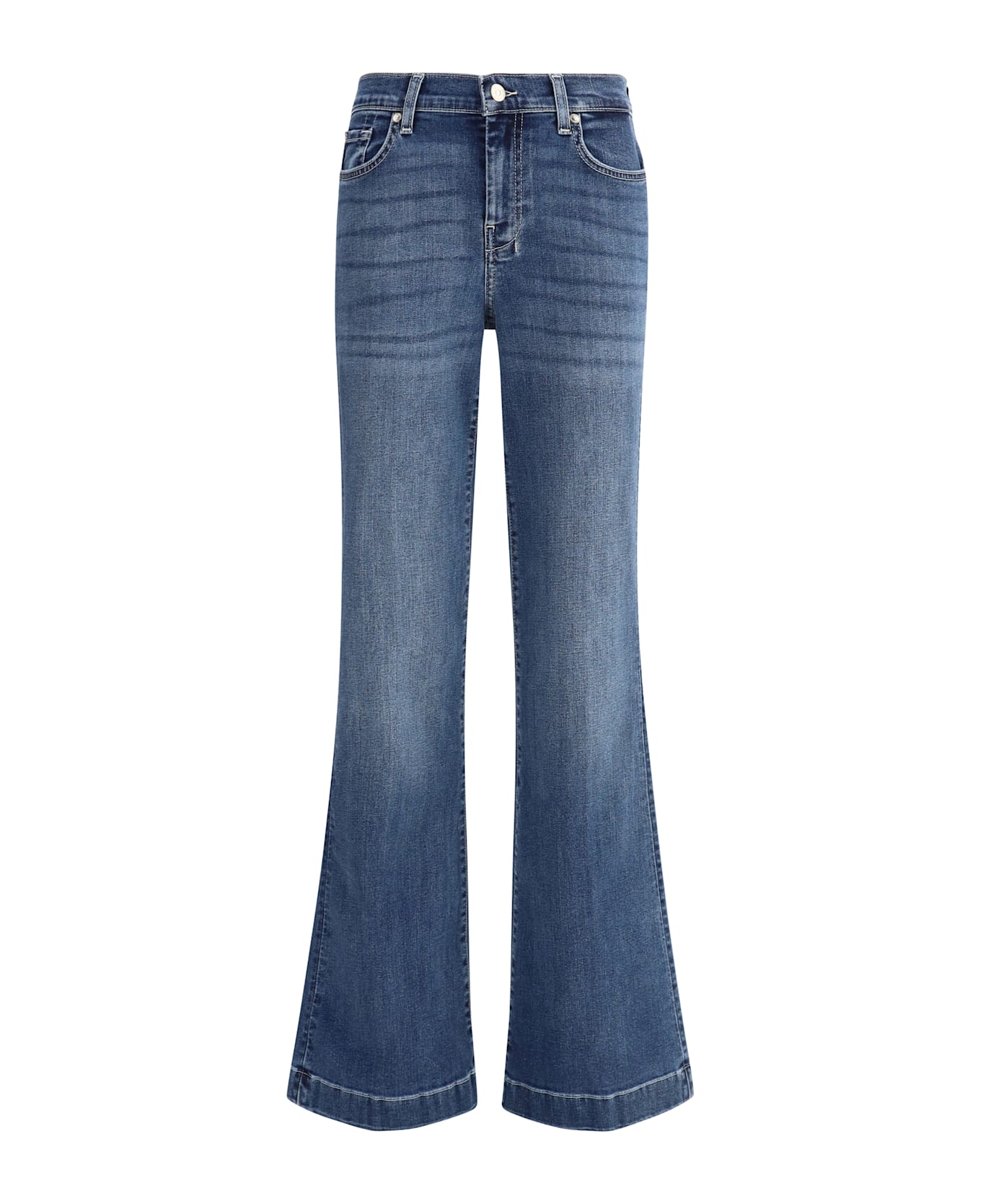 Cotton jeans by 7 for all mankind offer a sleek flare silhouette, perfect for slimming the figure with a sophisticated retro feel. the classic five-pocket design is complemented by a front button and zipper closure, as well as belt loops at the waist that enhance functionality. the iconic leather patch with the brand's signature pressure-printed print, applied on the back, lends a distinctive and authentic detail. a versatile and feminine garment, ideal for enhancing everyday looks with casual elegance.