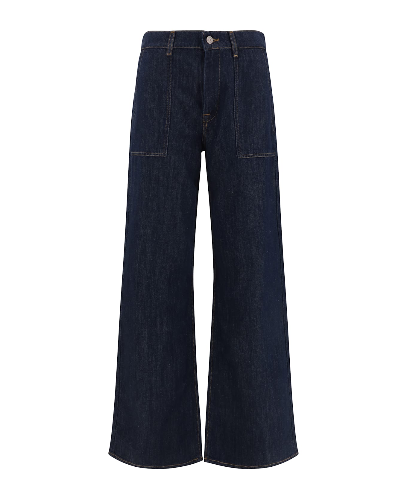 The lotta jeans by 7for feature a front button and zipper closure. on the front, they have two patch pockets, while on the back are two more patch pockets. the waistband is finished with belt loops, allowing further adjustment of the fit.