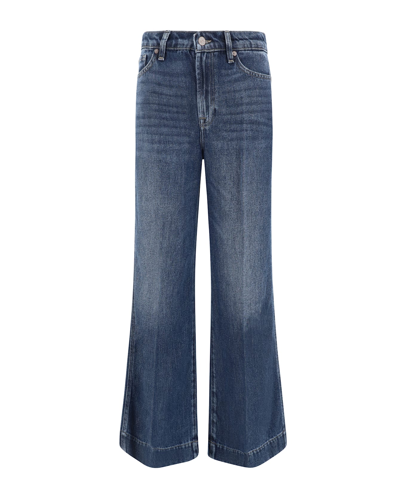 Modern dojo jeans by 7for are a wide leg style with a contemporary fit, featuring a five-pocket design that makes them practical and versatile. the front closure is zipper and button, while belt loops on the waistband allow for customization of the fit. these jeans offer the perfect balance of comfort and style, ideal for a casual yet sophisticated look.