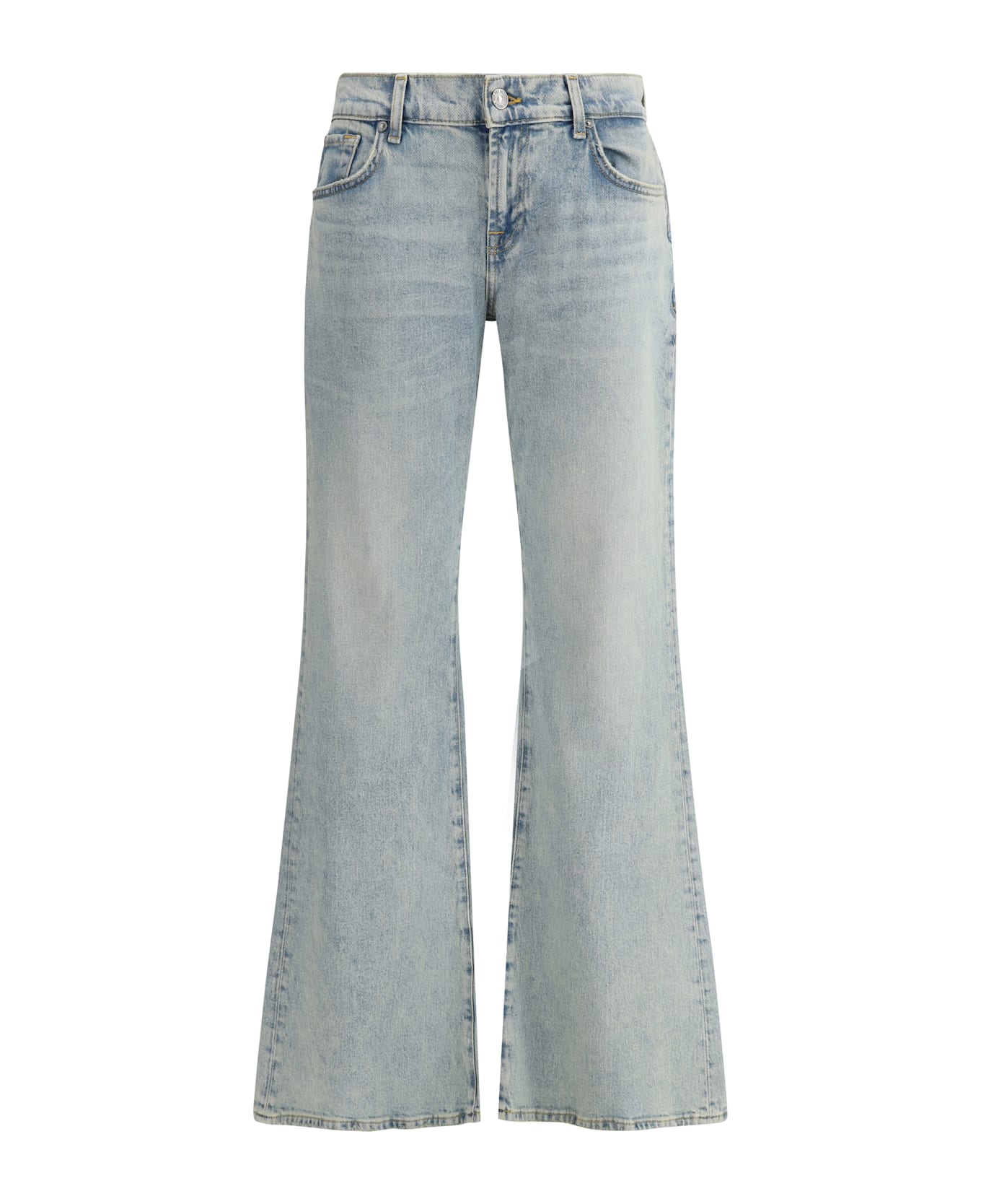The spencer flare sahara cotton jeans by 7for have a mid-rise waist and a five-pocket flare design. the front closure is button and zipper, while the waistband features belt loops. the garment is embellished with the brand's iconic pressure-printed signature leather patch applied to the back.
