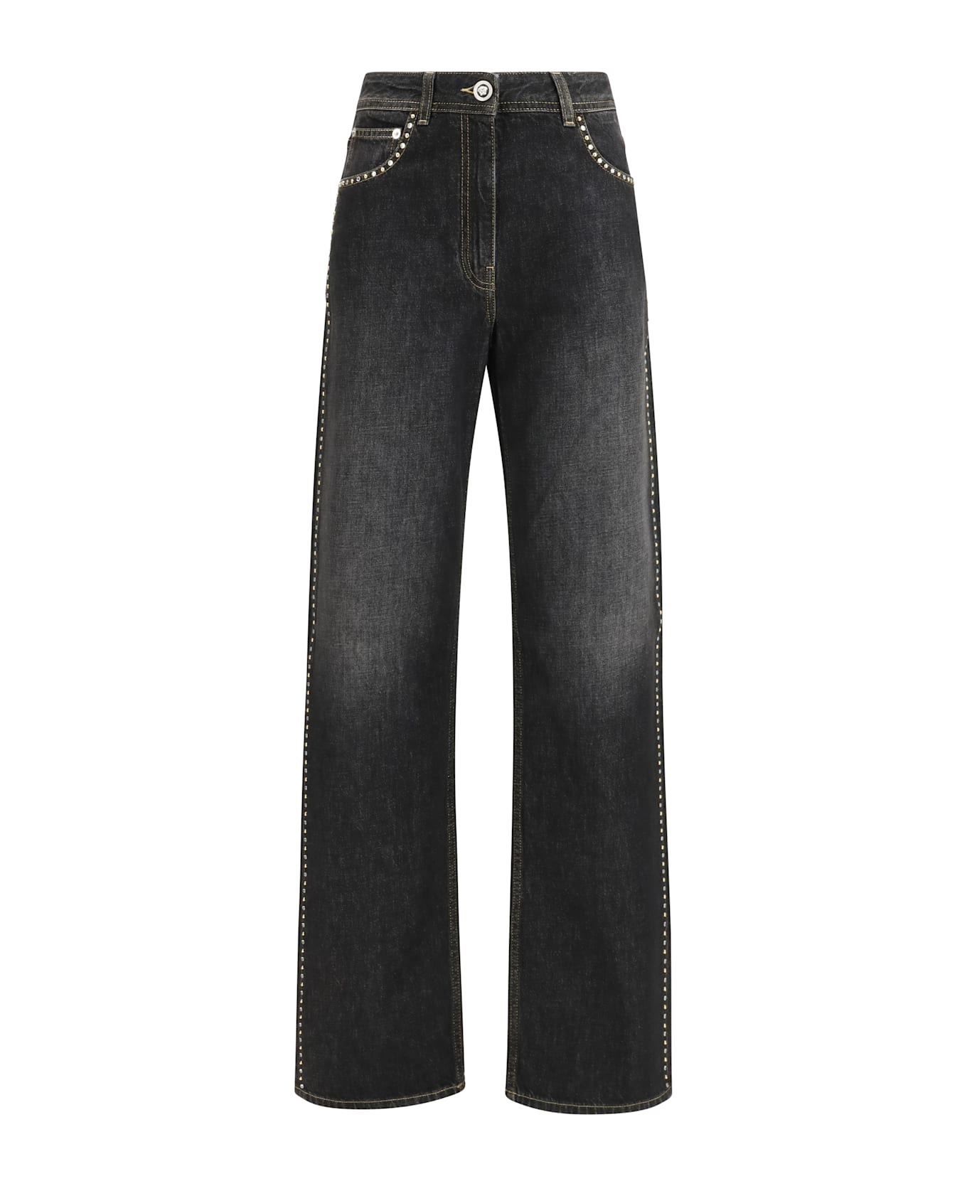 The straight jeans by versace with studs combine classic denim with iconic brand details, such as the medusa button and leather logo appliqué. decorated with studs and crystals, they offer a rock-chic touch. the five-pocket style and button and zip closure complete the practical and stylish design. perfect for a bold and sophisticated look. Composition: 100% % Cotton