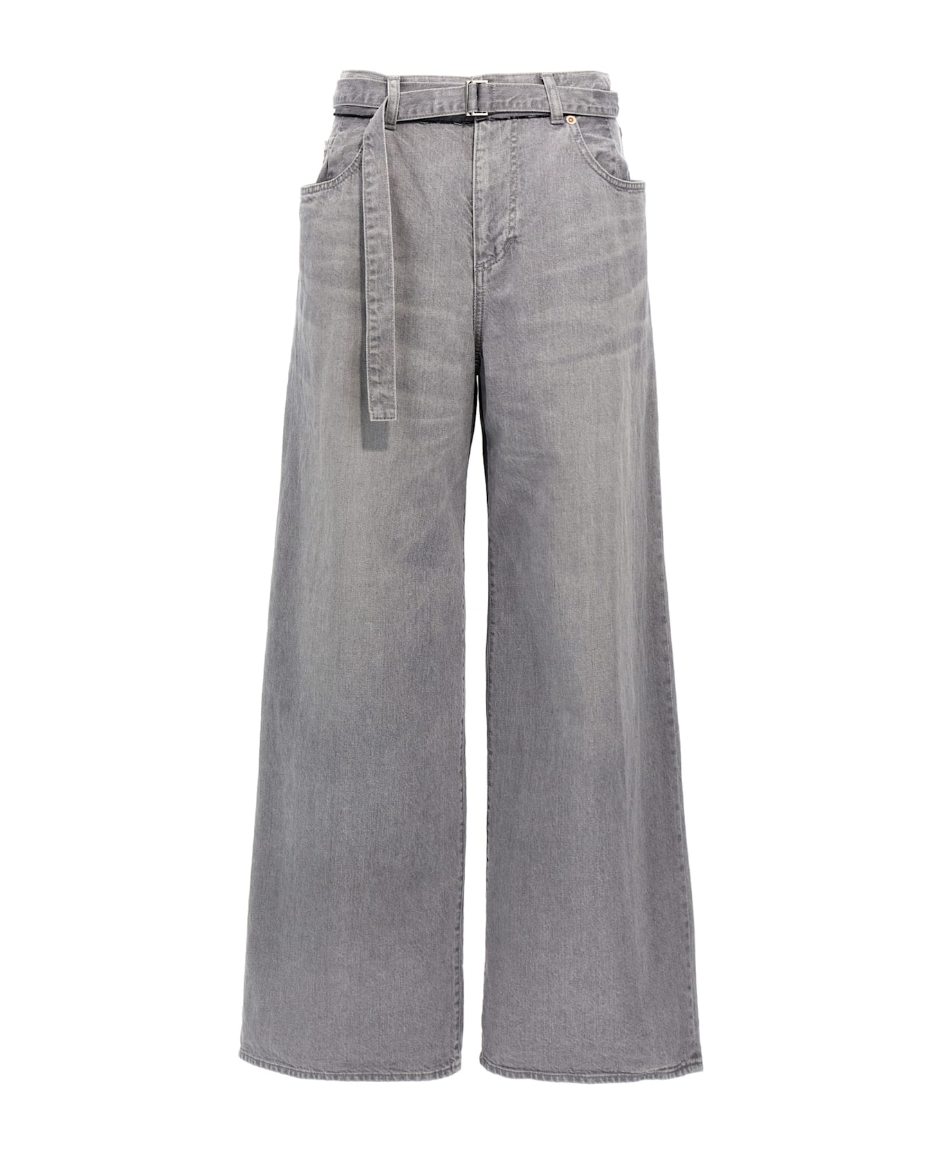 'Wide' cotton denim jeans with flared wide leg, pockets, zip and button closure, adjustable and removable belt.
