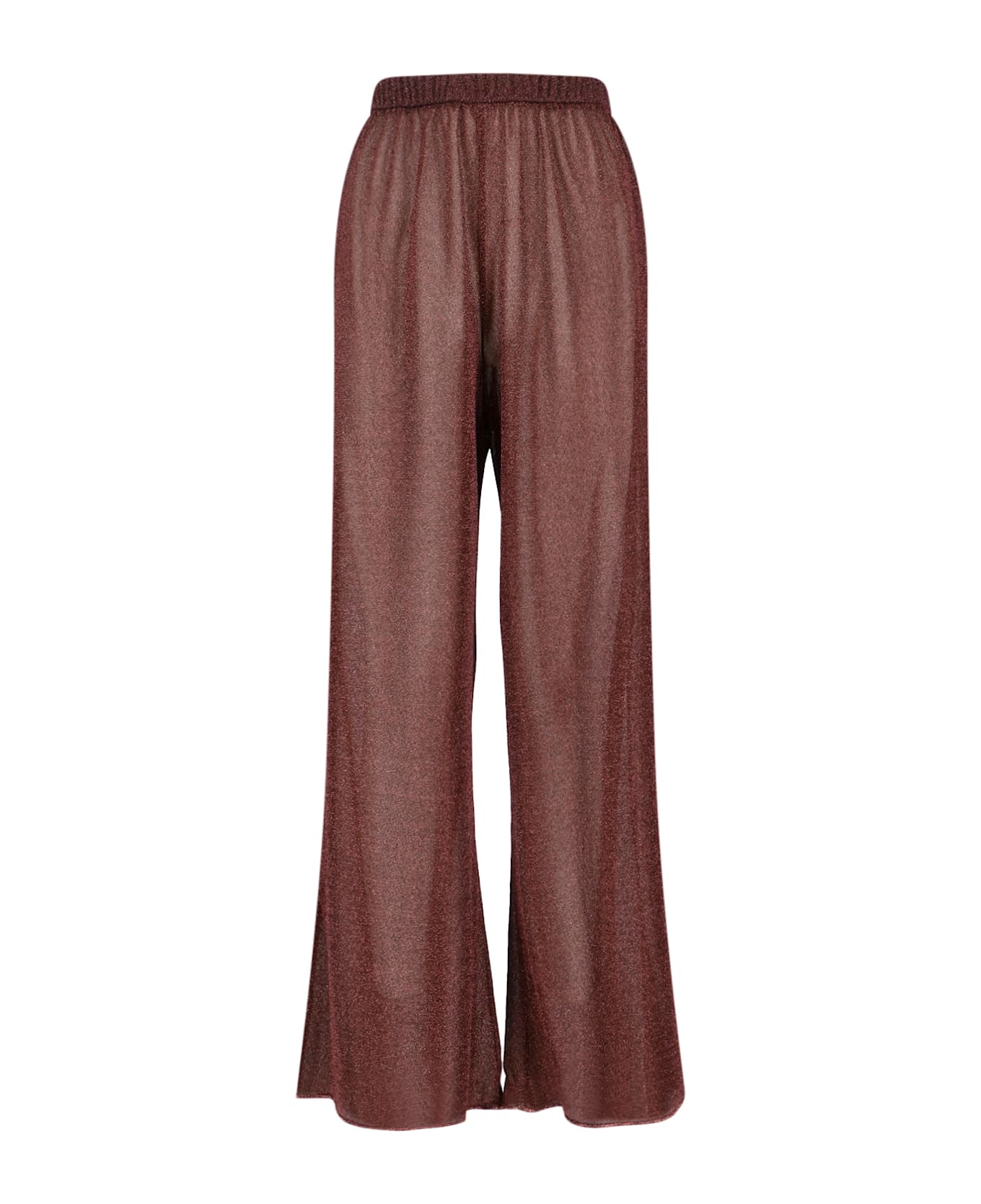 Oseree "lumière" pants in brown metallic semi-transparent fabric, high waist elasticized, curled waistband, wide leg. Composition: 64% Polyamide, 36% Metallic Fiber