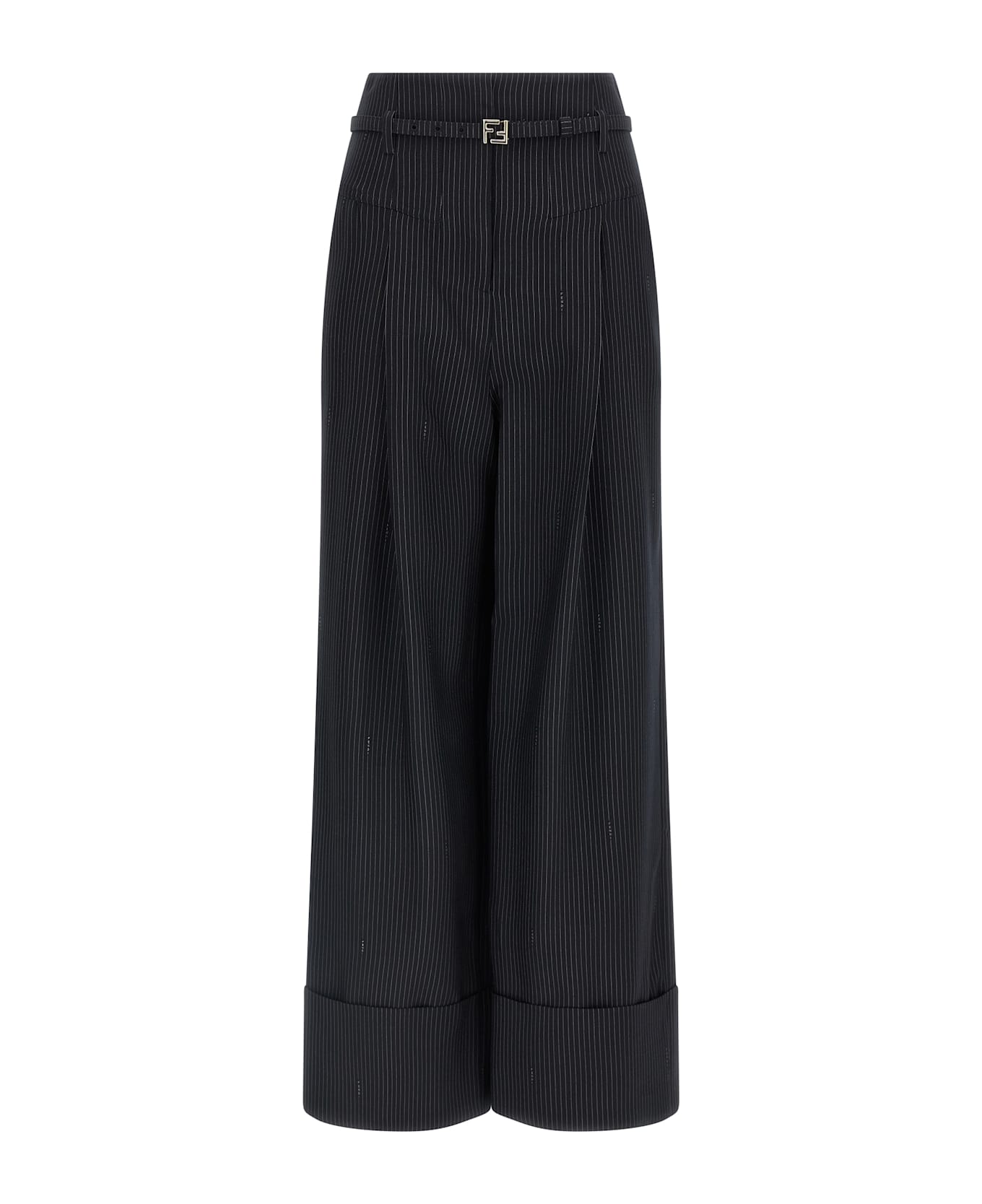 Fendi wool pants with pinstripe pattern, high waist with basque detail, front pin tucks, wide leg, hook and button zip closure, pockets, turn-up hem, belt with removable metal FF logo buckle. Composition: 80% wool, 20% viscose