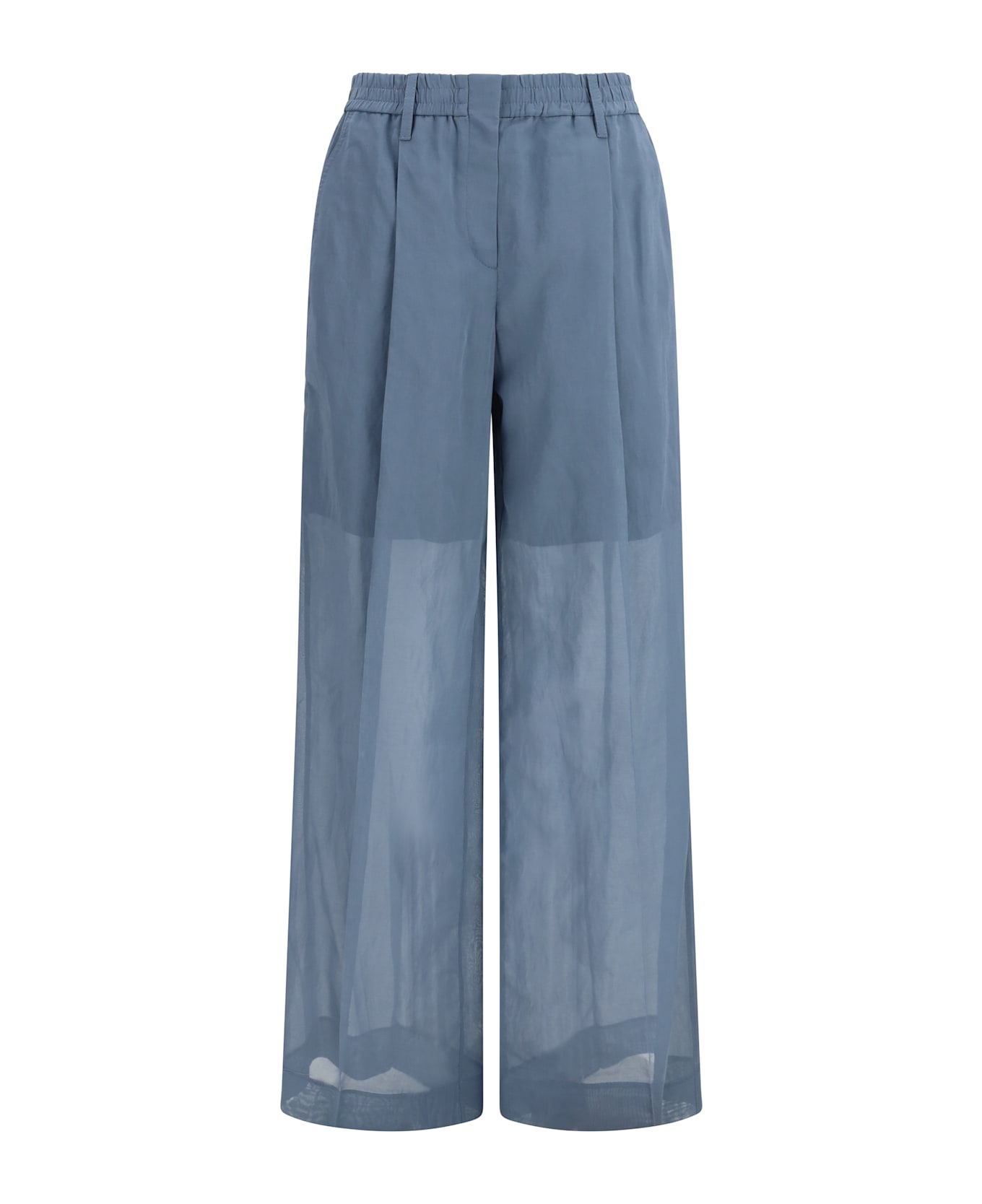 The sartorial track pants by brunello cucinelli are made of cotton organza, characterized by a fluid line with front pleats that define the structure of the leg. they feature a zip closure with metal hook and counter button, an elasticated waistband, front american pockets, and rear welt pockets. the model is half-lined in silk-blend crêpe and finished with brunello cucinelli s signature nickel-free monili decoration, a distinctive detail of the house.
