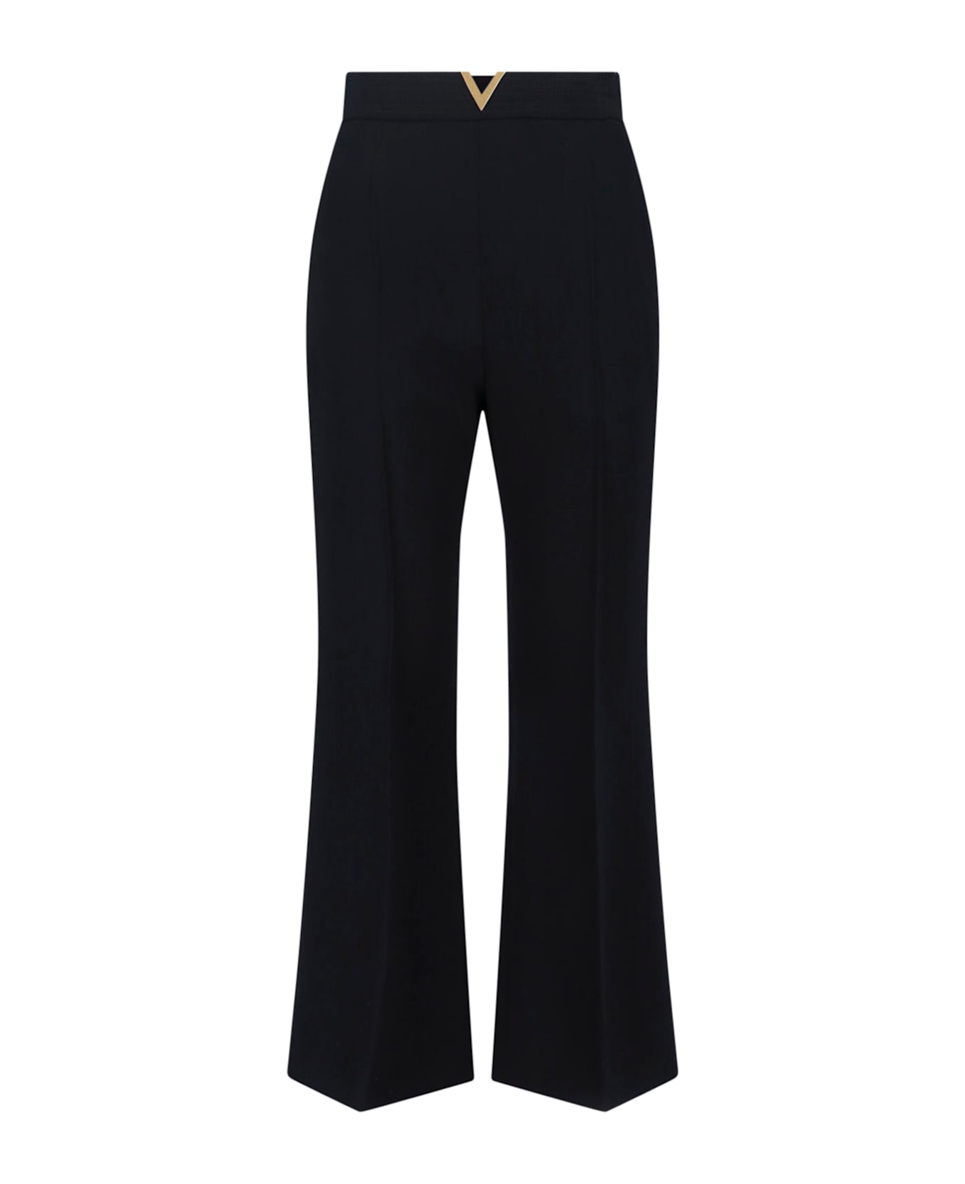 Valentino "vlogo signature" black virgin wool pants with high waist, waist strap, gold metal "vlogo signature" logo detail at the waist, two side pockets, two back welt pockets, wide leg.