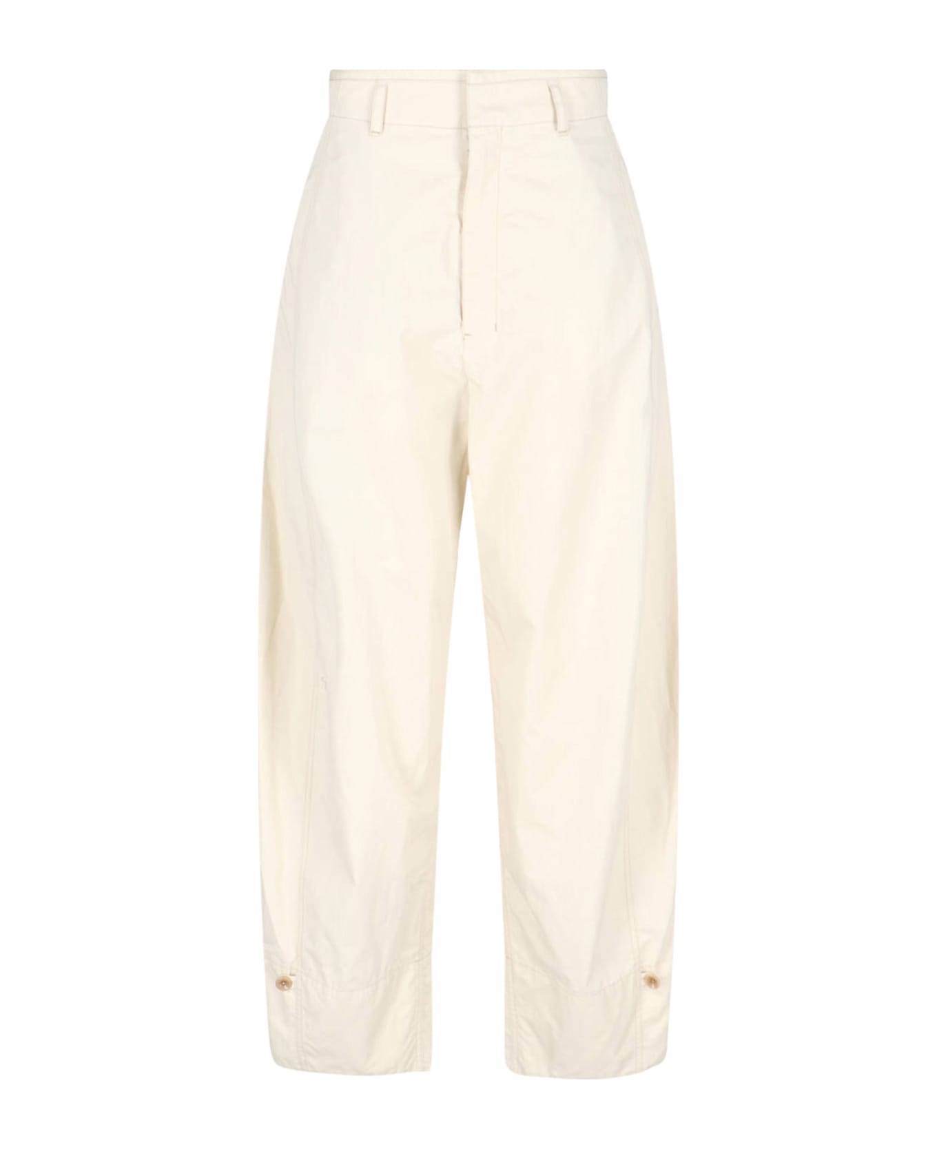 Lemaire 'Volume' wide pants in cream cotton with high waist, belt loops, hook and zip closure, two side pockets, two back welt pockets, adjustable with buttons on the hem, wide leg.