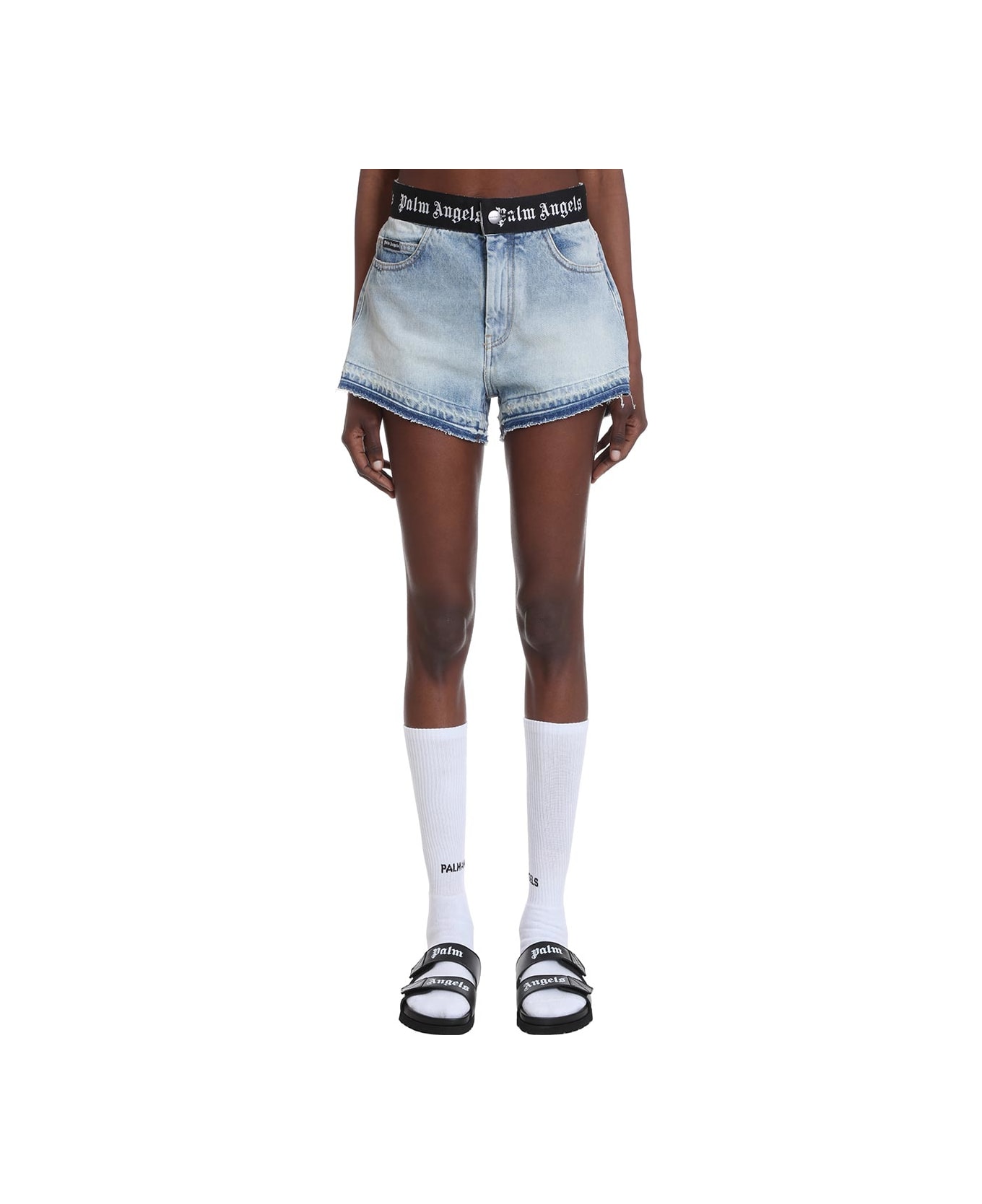 Shorts in cyan denim, five pockets, zip clousure, logo printed, destroyed detail, model is 180 cm and wears size 27