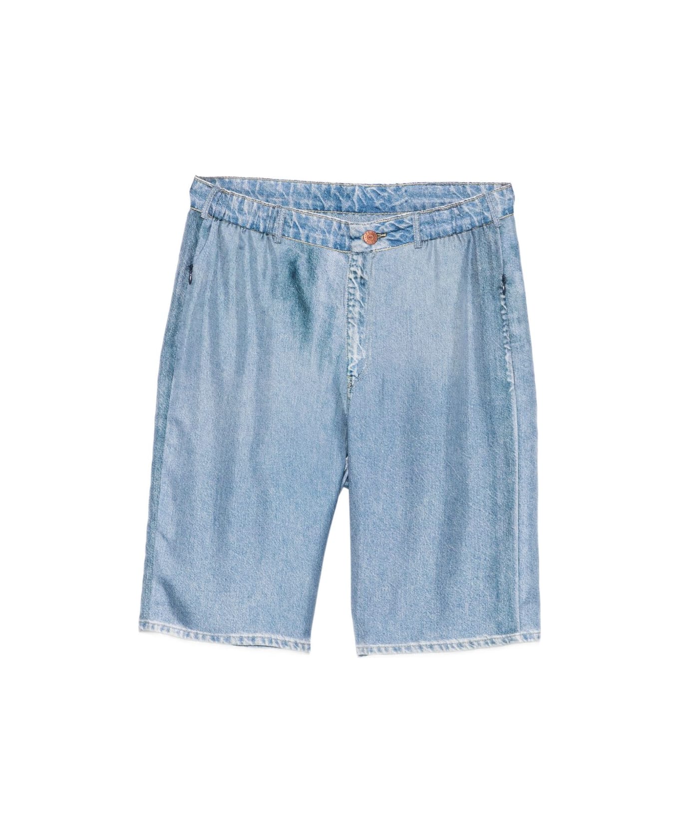 blue elasticated waistband side zip pockets trompe l'oeil print silk