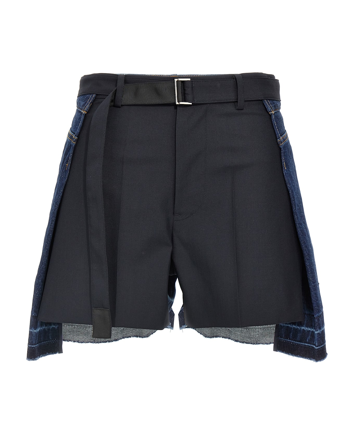 Cotton denim shorts with wool insert on the front, hook and button zip closure, removable grosgrain belt, pockets, wide leg with stretched pleat.