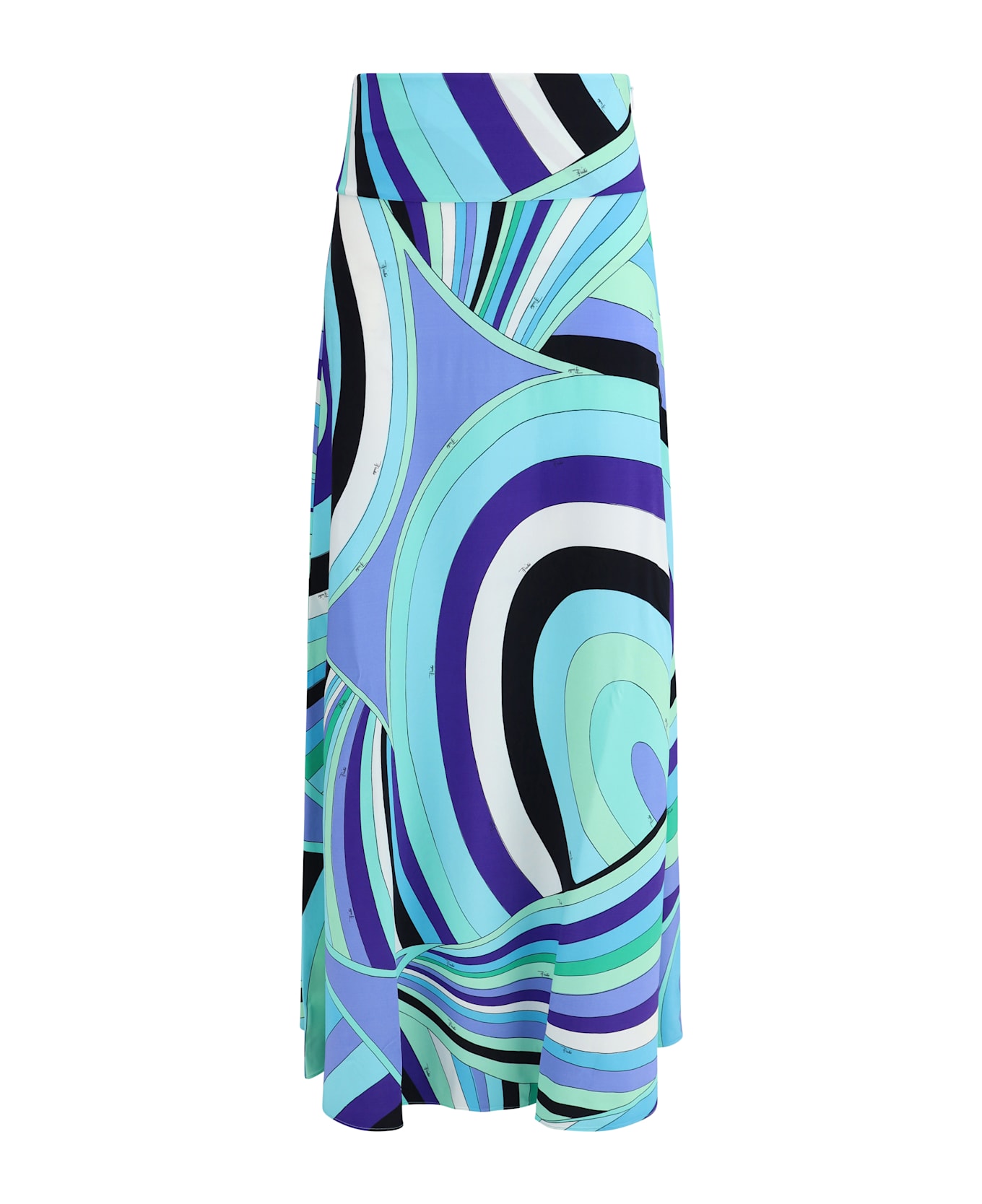 Pucci's iride print long skirt by pucci combines elegance and versatility in a striking garment. the fitted waist enhances the figure, while the side closure with concealed zipper ensures a clean and sophisticated line. the loose fit lightly accompanies movements, enhanced by the iconic iride print, symbol of the maison's vibrant and unmistakable style.