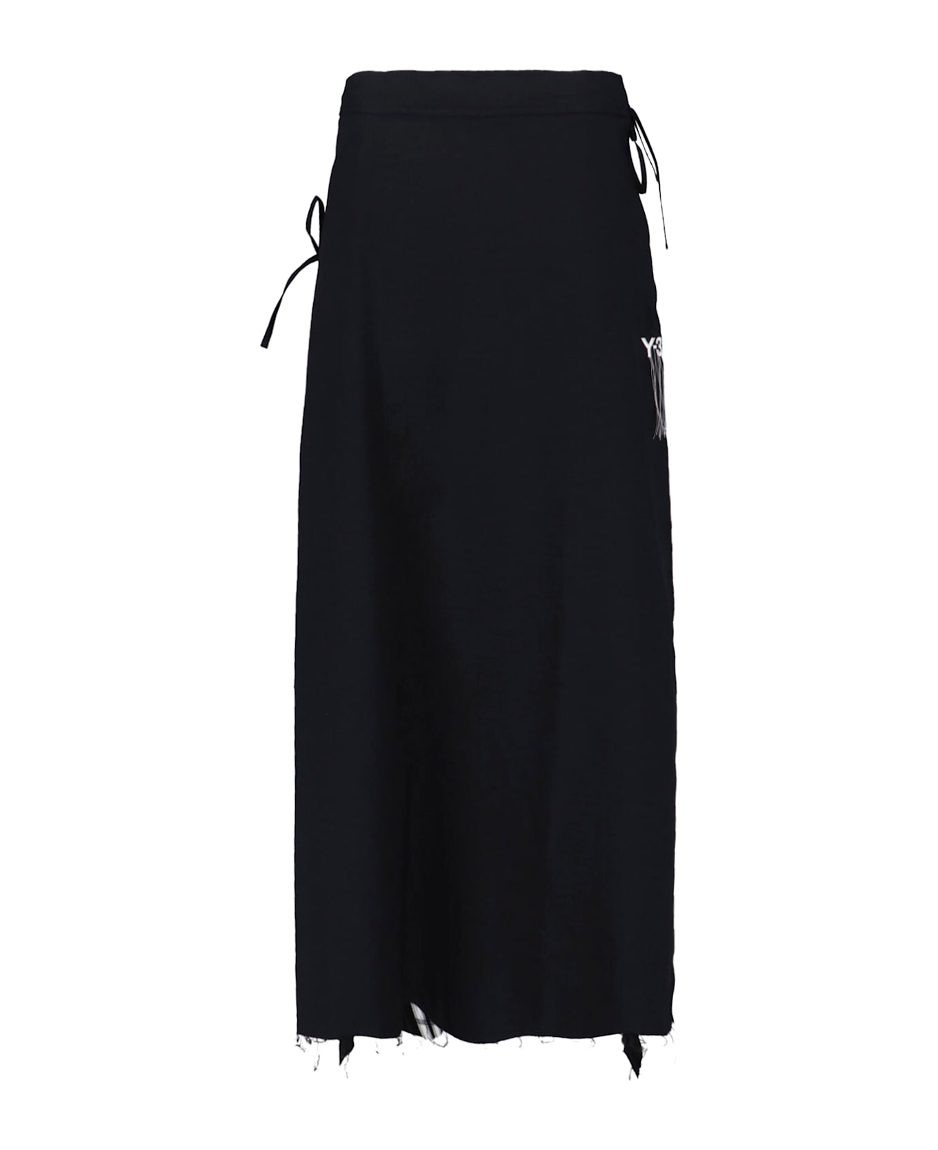 Y-3 midi skirt in black recycled fabric, medium waist, side ribbon closure, contrasting side logo, asymmetrical hem. Composition: 100% Recycled Polyester