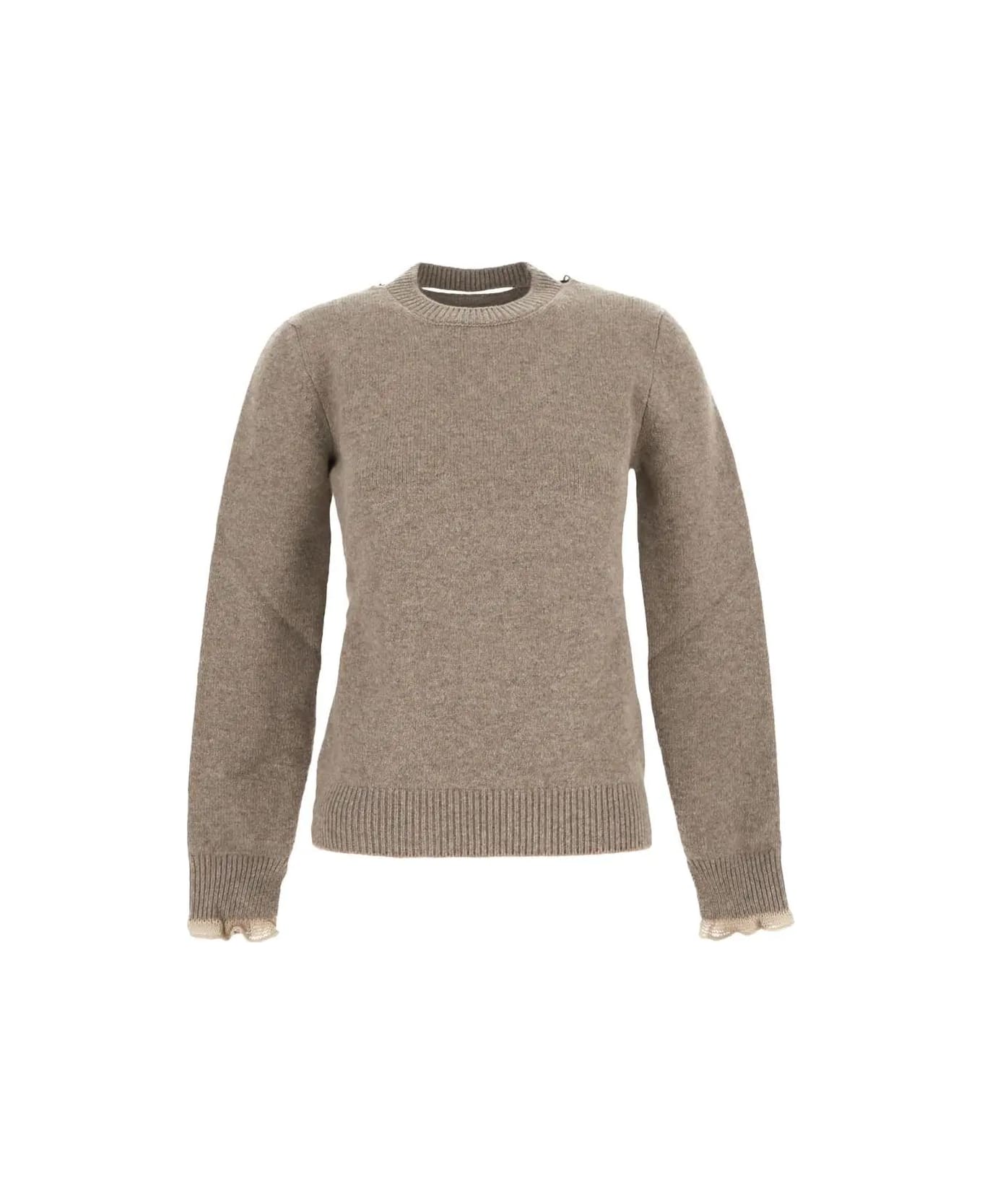 Fendi pullover in beige cashmere yarn with ribbed edges, raw details for an unfinished effect, long sleeves, a round neck and loose fit. Composition: 95% Cashmere, 4% Polyamide, 1% Polyurethane