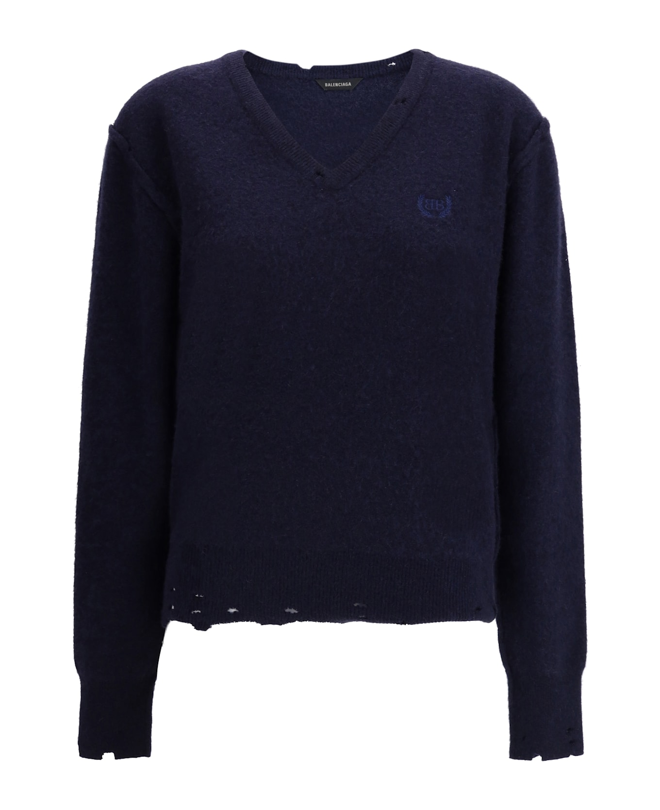 Balenciaga's cashmere sweater combines comfort and style with a touch of retro inspiration. made of fine cashmere, it features a v-neck on the front, the iconic embroidered logo prominently displayed and a vintage worn-effect design that lends character to the garment. ribbed cuffs and hem ensure a comfortable, structured fit.