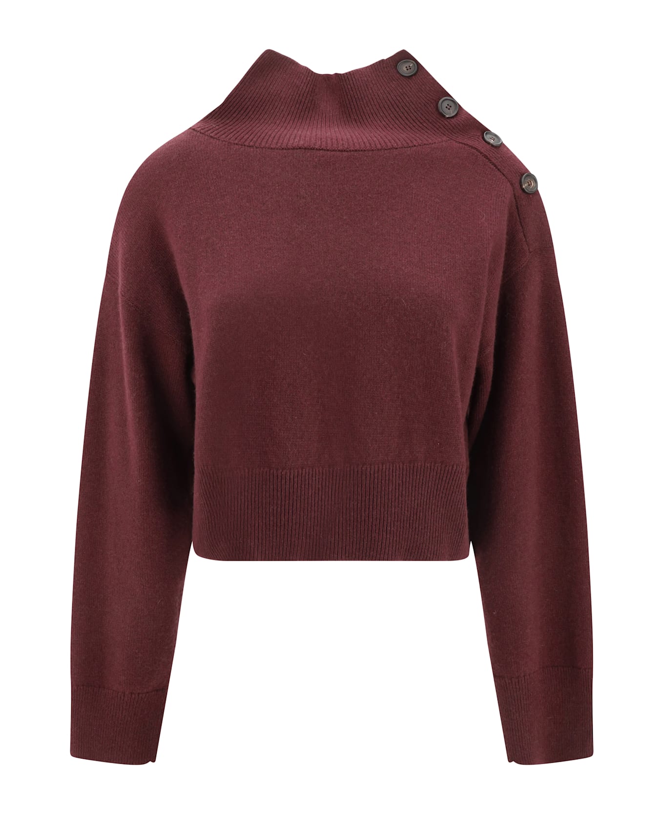 Brunello cucinelli's cashmere sweater is an elegant and innovative garment, featuring an adjustable high collar with buttons, which also open along the shoulder, offering a distinctive and practical detail. the cropped pattern gives a modern, dynamic silhouette, while the high ribbed cuffs and high ribbed hem add structure and definition to the garment. crafted from high-quality cashmere, this sweater is ideal for a sophisticated yet comfortable look, perfect for any occasion.