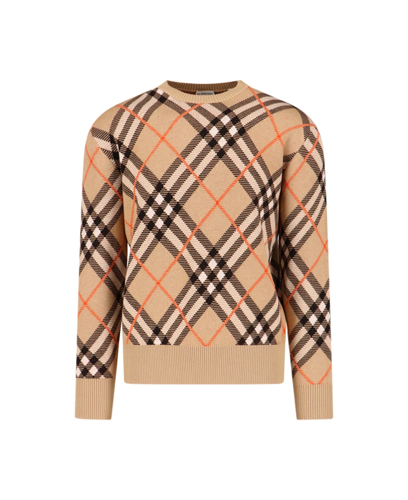 Burberry 'Check' crew neck sweater in beige stretch wool and mohair with iconic all-over logo pattern, central back split, ribbed trims, straight hem. Composition: 86% Wool, 7% Mohair, 6% Polyamide, 1% Elastane