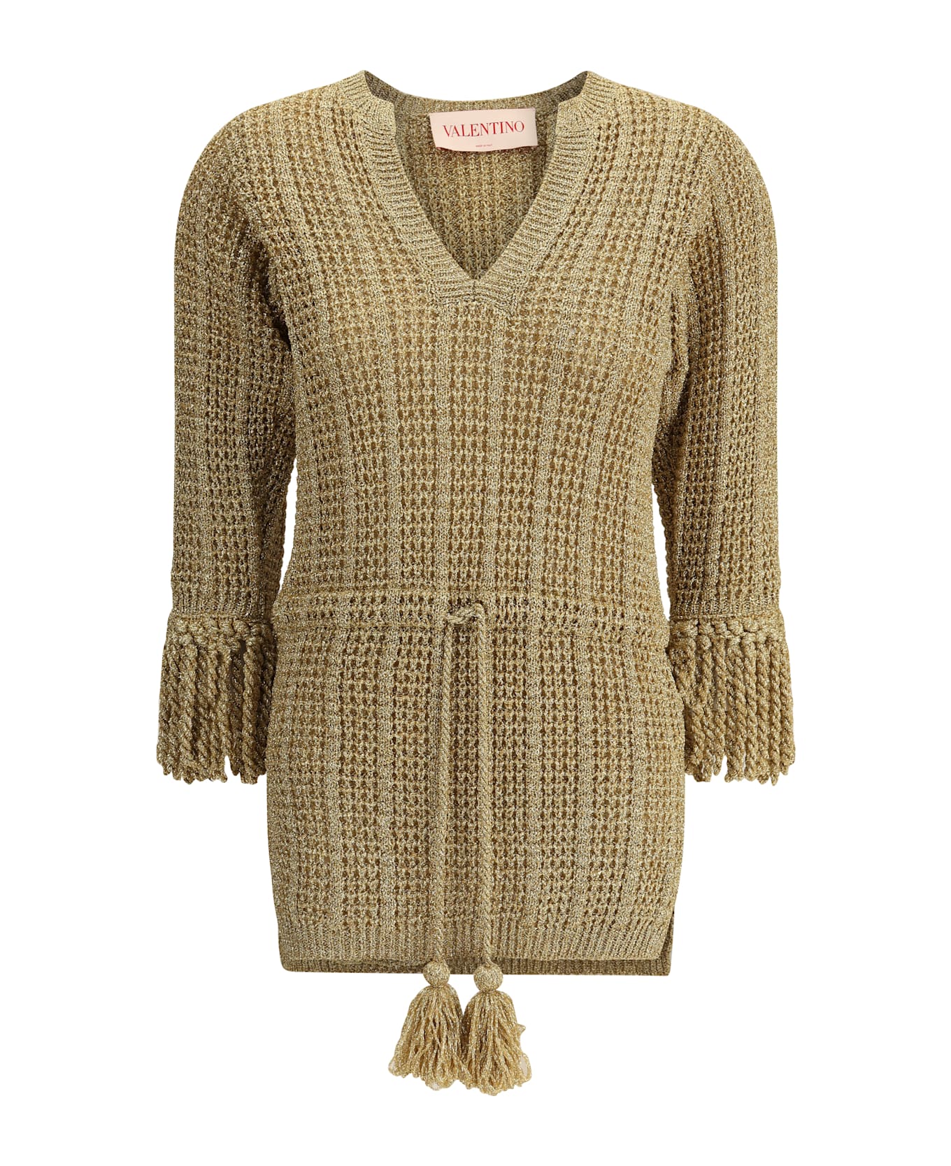 Valentino's short dress is an elegant and sophisticated piece that combines style and originality to perfection. made of lurex knit, the shiny fabric discreetly catches the light, lending a touch of sophistication. the design features a v-neckline that adds an accent of sensuality, while the adjustable drawstring waist allows you to easily adjust it to your silhouette. the two side slits give movement to the dress, making it dynamic and feminine, while the sleeves with tassels, a distinctive detail, add a bohemian and sophisticated touch.