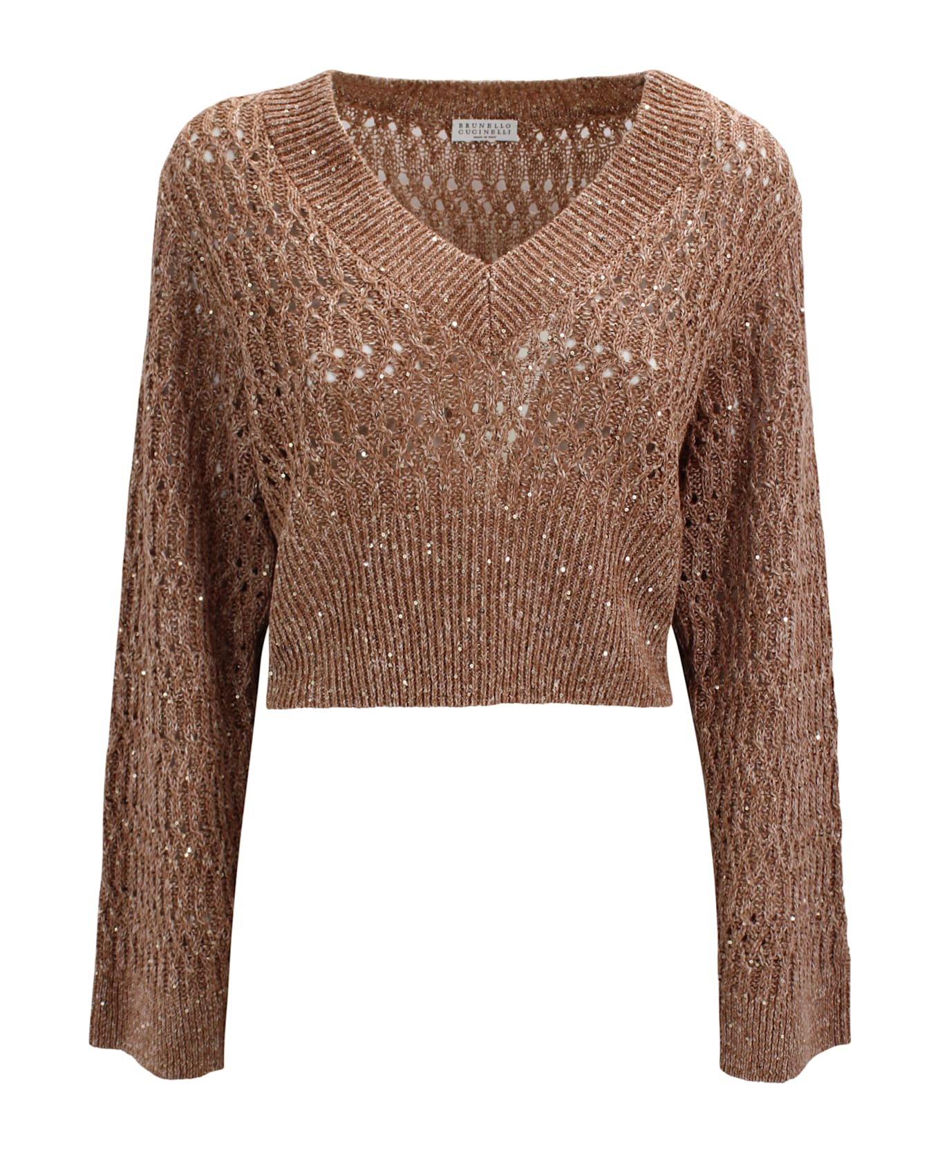 Made in Italy sweater featuring openwork knit, with a V neck and dropped shoulder sleeves. The lightweight and sophisticated design makes it a versatile piece for casual or refined looks. Features Origin: Italy Openwork knit Crew neckline Dropped shoulder sleeves Composition: 100% Cotton