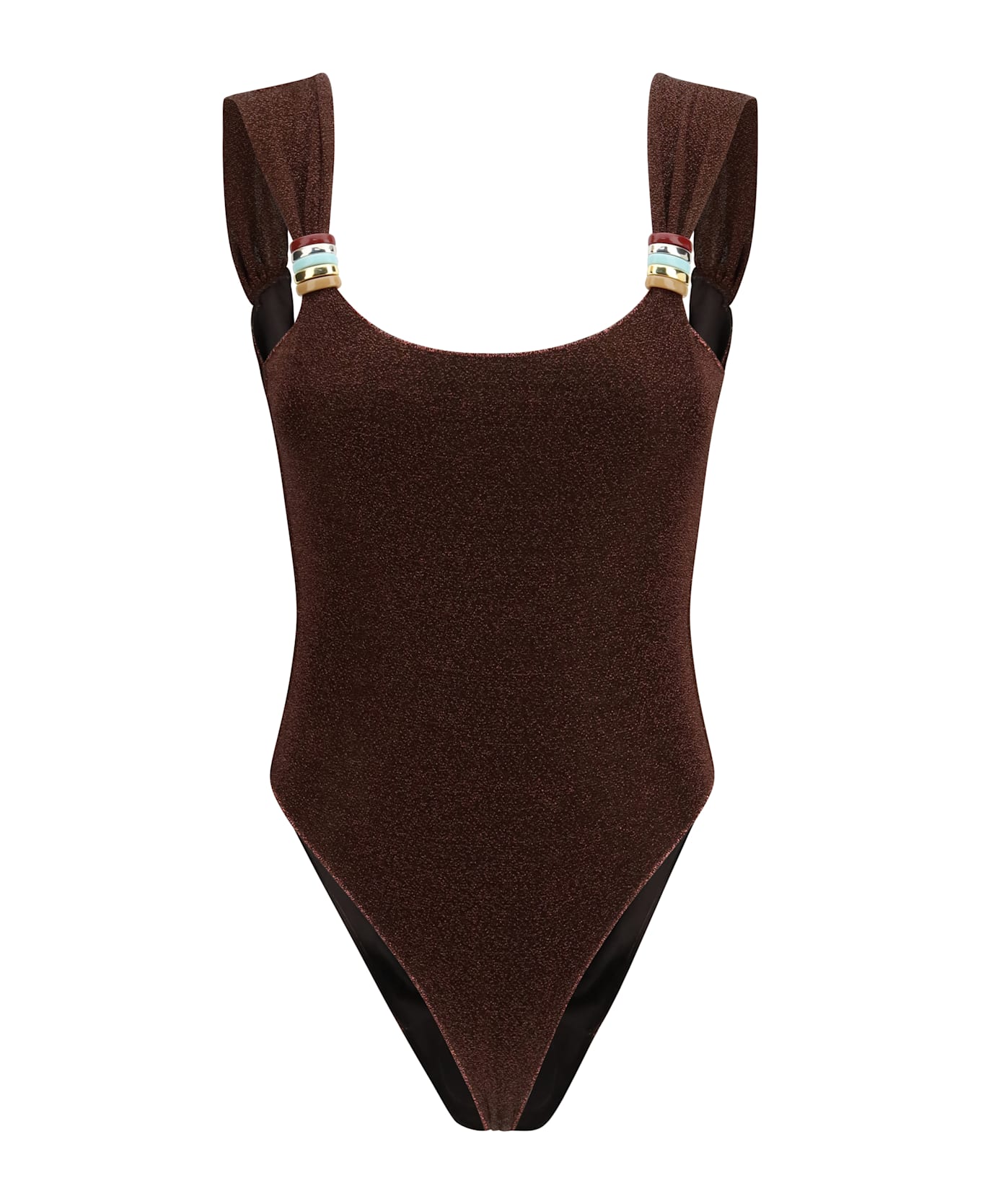 The lumière multi ring maillot one piece by oséree reimagines classic swimwear with a bold, contemporary spirit. crafted from the brand s signature shimmering fabric, this one-piece is defined by sleek cut-outs linked through multicolor rings that sculpt the silhouette and add a vibrant, artistic touch. elegant yet daring, it perfectly captures oséree s playful sophistication, making it an eye-catching choice from sunrise to sunset.