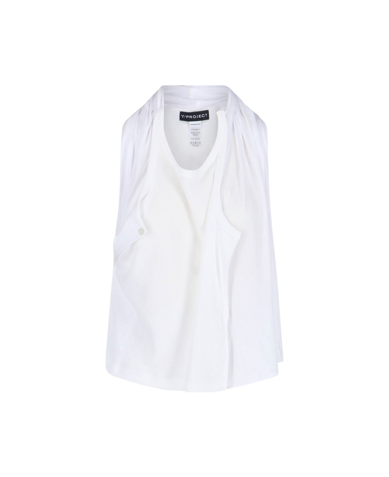 Y Project draped tank top in white cotton with double layer design, ribbed pattern, round neckline, front button closure, straight hem.